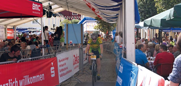 Am Abend herrscht im Stadtzentrum Party-Stimmung: Im Festzelt heizt ein DJ dem Publikum ein, im historischen Stadtkern wird das bevorstehende Rennen gefeiert. Wir werfen einen Blick ins Festzelt: Mit Absperrgittern wurden zwei Fahrbahnen geschaffen, jeweils flankiert von Tischen und Bänken. Auf einer Bahn fährt man in die Wechselzone wo der Staffelstab übergeben wird. Auf der anderen Bahn startet der neue Fahrer in seine Runde. Apropos Runde: 17 Kilometer, gespickt mit einer gut fünf Kilometer langen, knackigen Steigung, die sich bis auf 510 Meter hochschraubt. Weit vor Mitternacht kehren wir dem Treiben den Rücken, um ausgeruht in den Renntag zu starten.