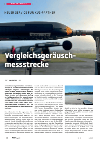10 %u2116 83 2 /2025RUND UMS FAHRENEine Alternative ist die sogenannte Vergleichsger%u00e4uschmessstrecke, die unter bestimmten Voraussetzungen ebenfalls f%u00fcr Ger%u00e4uschmessungen im Einzelbetriebserlaubnisverfahren genutzt werden kann. So muss die Strecke beispielsweise mindestens 250 Meter lang und drei Meter breit sein (eine l%u00e4ngere Strecke ist in der Praxis von Vorteil). Eine maximale Fahrgeschwindigkeit von 100 km/h muss erreicht werden k%u00f6nnen, und die Strecke muss eine asphaltierte Fahrbahn aufweisen (Beton ist nur zul%u00e4ssig, wenn er im Bereich des Messfelds und in einem Abstand von zehn Metern davor bzw. dahinter keine Dehnfugen aufweist). Die %u00dcberpr%u00fcfung und Freigabe einer solchen Vergleichsger%u00e4uschmessstrecke ist zwar ebenfalls mit Anforderungen verbunden, jedoch ist das Verfahren im Vergleich zur ISO-zertifizierten Ger%u00e4uschmessstrecke einfacher und deutlich weniger kostenintensiv.Die Experten der K%u00dcS Technik GmbH haben nun erfolgreich die %u00dcberpr%u00fcfung der ersten Vergleichsger%u00e4uschmessstrecke f%u00fcr einen K%u00dcS-Partner durchgef%u00fchrt: %u201eDamit k%u00f6nnen wir das Spektrum unseres Technischen Dienstes der K%u00dcS im Bereich des Einzelbetriebserlaubnisverfahrens erheblich erweitern%u201c, betont Benjamin Wertz, Leiter des Technischen Dienstes. Zusammen mit seinem Team steht er den K%u00dcS-Partnern gerne zur Verf%u00fcgung, wenn es um die Durchf%u00fchrung von Messungen oder die %u00dcberpr%u00fcfung einer Vergleichsger%u00e4uschmessstrecke geht. Die f%u00fcr die Durchf%u00fchrung von Fahrger%u00e4uschmessungen ben%u00f6tigten Messmittel k%u00f6nnen %u00fcber den Messmittel-Service der K%u00dcS gemietet werden, sodass ein Kauf nicht erforderlich ist: %u201eDas ist eine attraktive L%u00f6sung, insbesondere wenn solche Messungen nur gelegentlich durchgef%u00fchrt werden%u201c, erkl%u00e4rt Benjamin Wertz.%u201eGer%u00e4uschmessungen sind ein entscheidender Beitrag zur Zul%u00e4ssigkeit von Fahrzeugen, und auch der Gesetzgeber spricht hier klare Vorgaben aus. Mit diesem erweiterten Serviceangebot leistet die K%u00dcS Technik GmbH einen weiteren Beitrag zum Umweltschutz. F%u00fcr unsere Partner ist die K%u00dcS damit auch in diesem Bereich wie gewohnt ein zuverl%u00e4ssiger Ansprechpartner%u201c, so Peter Schuler, Hauptgesch%u00e4ftsf%u00fchrer der K%u00dcS.NEUER SERVICE F%u00dcR K%u00dcS-PARTNERVergleichsger%u00e4uschmessstreckeGer%u00e4uschmessungen im Rahmen von Untersuchungen im Einzelbetriebserlaubnisverfahren unterliegen komplexen Anforderungen. Sie k%u00f6nnen auf einer ISO-zertifizierten Ger%u00e4uschmessstrecke durchgef%u00fchrt werden, wobei geeignete Strecken nur in begrenztem Umfang zur Verf%u00fcgung stehen. Dies kann mit einem erh%u00f6hten Zeitaufwand und zus%u00e4tzlichen Kosten verbunden sein, insbesondere wenn eine weite Anfahrt f%u00fcr den Kunden und den Unterschriftsberechtigten erforderlich wird, um eine Ger%u00e4uschmessung an einem Fahrzeug vorzunehmen.TEXT UND FOTOS K%u00dcS