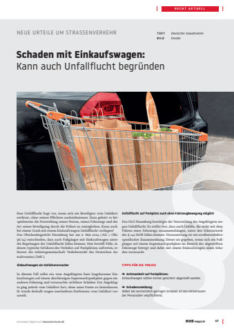 Autonews t%u00e4glich auf newsroom.kues.de 17RECHT AKTUELLNEUE URTEILE UM STRASSENVERKEHR TEXT Deutscher AnwaltvereinBILD Envato Schaden mit Einkaufswagen: Kann auch Unfallflucht begr%u00fcndenEine Unfallflucht liegt vor, wenn sich ein Beteiligter vom Unfallort entfernt, ohne seinen Pflichten nachzukommen. Dazu geh%u00f6rt es beispielsweise die Feststellung seiner Person, seines Fahrzeugs und der Art seiner Beteiligung durch die Polizei zu erm%u00f6glichen. Kann auch bei einem Crash mit einem Einkaufswagen Unfallflucht vorliegen?Das Oberlandesgericht Naumburg hat am 6. Mai 2024 (AZ: 1 ORs 38/24) entschieden, dass auch Fu%u00dfg%u00e4nger mit Einkaufswagen unter die Regelungen der Unfallflucht fallen k%u00f6nnen. Dies betrifft F%u00e4lle, in denen typische Gefahren des Verkehrs auf Parkpl%u00e4tzen auftreten, erl%u00e4utert die Arbeitsgemeinschaft Verkehrsrecht des Deutschen Anwaltvereins (DAV). Einkaufswagen als UnfallverursacherIn diesem Fall rollte ein vom Angeklagten kurz losgelassener Einkaufswagen auf einem absch%u00fcssigen Supermarktparkplatz gegen ein anderes Fahrzeug und verursachte sichtbare Sch%u00e4den. Der Angeklagte ging jedoch vom Unfallort fort, ohne seine Daten zu hinterlassen. Er wurde deshalb wegen unerlaubten Entfernens vom Unfallort verurteilt. Unfallflucht auf Parkplatz auch ohne Fahrzeugbewegung m%u00f6glichDas OLG Naumburg best%u00e4tigte die Verurteilung des Angeklagten wegen Unfallflucht. Es stellte fest, dass auch Unf%u00e4lle, die nicht mit dem F%u00fchren eines Fahrzeugs zusammenh%u00e4ngen, unter den Schutzzweck des %u00a7 142 StGB fallen k%u00f6nnen. Voraussetzung ist ein stra%u00dfenverkehrsspezifischer Zusammenhang. Dieser sei gegeben, wenn sich ein Fu%u00dfg%u00e4nger auf einem Supermarktparkplatz im Bereich der abgestellten Fahrzeuge bewegt und dabei mit einem Einkaufswagen einen Schaden verursacht.TIPPS F%u00dcR DIE PRAXISARROW-ALT-RIGHT Achtsamkeit auf Parkpl%u00e4tzen: Einkaufswagen sollten immer gesichert abgestellt werden.ARROW-ALT-RIGHT Schadensmeldung: Selbst bei vermeintlich geringen Sch%u00e4den ist das Hinterlassen der Personalien verpflichtend.