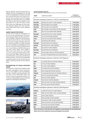 Autonews t%u00e4glich auf newsroom.kues.de 19RUND UMS FAHRENMaserati Grecale FolgorePorsche MacanMaximale Anh%u00e4ngelast gebremst(die verschiedenen Ausstattungs-/Motorvarianten sind nicht ber%u00fccksichtigt)Marke Modell/Version (kW/PS) Anh%u00e4ngelast/max. Reichweite (km)Maximale Anh%u00e4ngelast gebremst 1.700 bis 1.800 KilogrammMercedes EQB 300 Auto 4MATIC 71 kWh (168/228) 1.700 kg/468Mercedes EQE 350 4MATIC Auto (215/292) 1.700 kg/625Mercedes EQS 450 4MATIC Auto (265/360) 1.700 kg/793Audi Q8 e-tron/Q8 e-tron Sportback 95 kWh (250/340) 1.800 kg/460Volvo EX40 Twin Ultra AWD 82 kWh (300/408) 1.800 kg/536Mercedes EQA 300 4MATIC Auto 71 kWh (168/228) 1.800 kg/476VinFast VF 8 Eco Auto 88 kWh (260/353) 1.800 kg/471Volvo EC40 Twin Auto AWD 82 kWh (300/408) 1.800 kg/550Kia EV6 RWD 84 kWh (168/229) 1.800 kg/582Mercedes EQS 580 4MATIC Auto (400/544) 1.800 kg/654Genesis Electrified GV70 77 kWh (360/490) 1.800 kg/455Elaris Beo Comfort 72 kWh (150/204) 1.800 kg/489Mercedes EQE 500 4MATIC Auto (300/408) 1.800 kg/594Maserati Grecale Folgore 4WD Auto 105 kWh (410/557) 1.800 kg/500VW ID. Buzz GTX SWB 4MOTION Auto 84 kWh (250/340) 1.800 kg/421Maximale Anh%u00e4ngelast gebremst 2.000 bis 2.100 KilogrammBMW i7 xDrive60 4WD Auto 106 kWh (400/544) 2.000 kg/623Nio ET7 Auto 75 kWh (480/653) 2.000 kg/445Nio EL7 Auto 75 kWh (480/653) 2.000 kg/391BMW i5 xDrive40 Auto 84 kWh (290/394) 2.000 kg/564Zeekr 001 Privilege AWD 100 kWh (400/544) 2.000 kg/585Polestar 4 Long Range Dual Motor Perf. 100 kWh (400/544) 2.000 kg/590Audi Q6 e-Tron Auto 83 kWh (215/292) 2.000 kg/530Nio EL8 Auto 75 kWh (480/653) 2.000 kg/390Porsche Macan Electric 100 kWh (265/360) 2.000 kg/644Volvo EX90 Twin Motor Ultra AWD 106 kWh (330/449) 2.000 kg/700Audi A6 e-tron quattro 83 kWh (240/326) 2.100 kg/572Maximale Anh%u00e4ngelast gebremst 2.200 bis 2.500 KilogrammPolestar 3 LRDM Performance 111 kWh (380/517) 2.200 kg/560Volvo EX90 Twin Ultra AWD 7-Sitzer 111 kWh (300/408) 2.200 kg/621Tesla Model X AWD (493/670) 2.250 kg/625Lotus Eletre 600 AWD 112 kWh (450/612) 2.250 kg/600Lotus Emeya 600 GT AWD 102 kWh (450/612) 2.250 kg/610Audi Q6 E-tron Quattro Auto 100 kWh (285/388) 2.400 kg/622BMW iX xDrive45 Auto 100 kWh (300/408) 2.500 kg/578Kia EV9 Air AWD 99,8 kWh (283/385) 2.500 kg/512Quelle: Jato Dynamics / Stand: M%u00e4rz 2025 / Die angegebene maximale Reichweite ist ohne H%u00e4ngerbetrieb. Gelistet sind nur die PS-schw%u00e4chsten Versionen je Anh%u00e4ngelast einer Baureihe.EQE 350 4MATIC und der Mercedes EQS 450 4MATIC. Bei einer Anh%u00e4ngelast bis 1.800 kg ist die Auswahl gr%u00f6%u00dfer. Sie umfasst den Audi Q8 e-tron, den Elaris Beo, den Genesis GV70, den Kia EV6, den Maserati Grecale Folgore, ebenfalls drei Mercedes (EQA 300 4MATIC und EQS 500 bzw. EQS 580 4MATIC), dazu den VinFast VF 8, den Volvo EX40 & EC40 AWD sowie den Volkswagen ID. Buzz 4Motion. Bekannte Marken wie Audi und Mercedes stehen neben relativ neuen Anbietern wie Elaris. Angebot insgesamt %u00fcberschaubarDas f%u00e4llt in der Gruppe der Anh%u00e4ngelast von bis zu 2.000 kg noch deutlicher auf. Interessenten k%u00f6nnen w%u00e4hlen zwischen Audi Q6 etron, den BMW i7 xDrive60 und i5 xDrive40, dem Porsche Macan Electric, dem Volvo ES90 und den noch weniger bekannten NIO ET7, EL7 und EL8 und Zeekr 001 AWD. Oberhalb der 2.000-kg-Marke als Anh%u00e4ngelast sind es dann bis 2.250 kg die bekannten Marken Audi (A6 e-tron), Polestar (3 LRDM Performance) und Volvo (EX90 AWD), Tesla (Model X AWD) und Lotus (Eletre 600 und Emeya 600), die ein zul%u00e4ssiges Modell anbieten. Wer 2.400 kg an den Haken nehmen will, kann nur den Audi Q6 e-tron quattro als BEV-Zugfahrzeug nehmen. Sind 2.500 kg Anh%u00e4ngelast zu ziehen, kommen als reine Stromer nur der BMW iX xDrive45 und der Kia EV9 AWD in Frage.BEV-Zugfahrzeuge mit langsam wachsendem AngebotDie Auswahl an elektrischen Zugfahrzeugen mit hoher Anh%u00e4ngelast w%u00e4chst stetig. Dennoch ist das Angebot in den Gewichtsklassen %u00fcber 2 Tonnen noch %u00fcberschaubar. Wer mit einem E-Auto Wohnwagen ziehen oder schwere Lasten transportieren m%u00f6chte, sollte sich im Vorfeld deshalb sehr genau %u00fcber die zugelassene Anh%u00e4ngelast informieren.