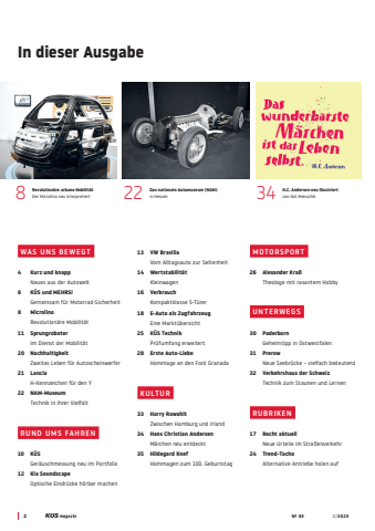 2 %u2116 83 2 /2025 WAS UNS BEWEGT 4 Kurz und knapp Neues aus der Autowelt6 K%u00dcS und MEHRSiGemeinsam f%u00fcr Motorrad-Sicherheit8 MicrolinoRevolution%u00e4re Mobilit%u00e4t11 SprungroboterIm Dienst der Mobilit%u00e4t20 NachhaltigkeitZweites Leben f%u00fcr Autoscheinwerfer21 LanciaH-Kennzeichen f%u00fcr den Y22 NAM-MuseumTechnik in ihrer Vielfalt RUND UMS FAHREN 10 K%u00dcSGer%u00e4uschmessung neu im Portfolio12 Kia SoundscapeOptische Eindr%u00fccke h%u00f6rbar machen13 VW BrasiliaVom Alltagsauto zur Seltenheit14 Wertstabilit%u00e4tKleinwagen16 VerbrauchKompaktklasse 5-T%u00fcrer18 E-Auto als ZugfahrzeugEine Markt%u00fcbersicht25 K%u00dcS TechnikPr%u00fcfumfang erweitert28 Erste Auto-LiebeHommage an den Ford Granada KULTUR 33 Harry RowohltZwischen Hamburg und Irland34 Hans Christian AndersenM%u00e4rchen neu entdeckt35 Hildegard KnefHommagen zum 100. Geburtstag MOTORSPORT 26 Alexander Kra%u00dfTheologe mit rasantem Hobby UNTERWEGS 30 PaderbornGeheimtipp in Ostwestfalen31 PrerowNeue Seebr%u00fccke %u2013 vielfach bedeutend32 Verkehrshaus der SchweizTechnik zum Staunen und Lernen RUBRIKEN 17 Recht aktuell Neue Urteile im Stra%u00dfenverkehr24 Trend-Tacho Alternative Antriebe holen auf8 Revolution%u00e4re urbane Mobilit%u00e4tDer Microlino neu interpretiertIn dieser Ausgabe34 H.C. Andersen neu illustriert 22 von Kat MenschikDas nationale Automuseum (NAM)in Hessen