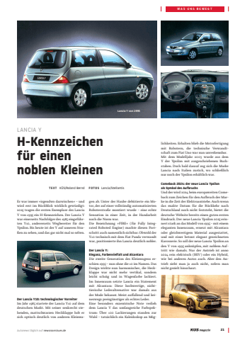 Autonews t%u00e4glich auf newsroom.kues.de 21WAS UNS BEWEGTEr war immer %u00bbirgendwo dazwischen%u00ab %u2013 und wird erst im R%u00fcckblick wirklich gew%u00fcrdigt: 2025 tragen die ersten Exemplare des Lancia Y von 1995 ein H-Kennzeichen. Der Lancia Y war einerseits Nachfolger des 1985 eingef%u00fchrten Y10, andererseits Wegbereiter f%u00fcr den Ypsilon. Bis heute ist der Y auf unseren Stra%u00dfen zu sehen, und das gar nicht mal so selten.Der Lancia Y10: technologischer VorreiterIm Jahr 1985 startete der Lancia Y10 auf dem deutschen Markt. Mit seiner senkrecht stehenden, mattschwarzen Heckklappe hob er sich optisch deutlich von anderen Kleinwagen ab. Unter der Haube deb%u00fctierte ein Motor, der auf einer vollst%u00e4ndig automatisierten Roboterstra%u00dfe montiert wurde %u2013 eine echte Sensation in einer Zeit, in der Handarbeit noch die Norm war. Die Bezeichnung %u00bbFIRE%u00ab (f%u00fcr Fully Integrated Roboted Engine) machte diesen Fortschritt auch namentlich sichtbar. Obwohl der Y10 technisch mit dem Fiat Panda verwandt war, positionierte ihn Lancia deutlich nobler.Der Lancia Y: Eleganz, Farbenvielfalt und AlcantaraDie zweite Generation des Kleinwagens erschien 1995 %u2013 nun ohne die 10 im Namen. Das Design wirkte nun harmonischer, die Heckklappe war nicht mehr vertikal, sondern leicht schr%u00e4g und in Wagenfarbe lackiert. Im Innenraum setzte Lancia ein Statement mit Alcantara: Diese hochwertige, nichttierische Lederalternative war damals aus der Mode bekannt. Meist auffallend und keineswegs preisg%u00fcnstiger als echtes Leder. Eine besonders exzentrische Note verlieh dem Lancia Y das umfangreiche Farbspektrum: %u00dcber 100 Lackierungen standen zur Wahl %u2013 tats%u00e4chlich ein Kaleidoskop an M%u00f6gTEXT K%u00dcS/Roland Bernd FOTOS Lancia/Stellantislichkeiten. Erhalten blieb die Motorfertigung mit Robotern, die technische Verwandtschaft zum Fiat Uno war nun unverkennbar. Mit dem Modelljahr 2003 wurde aus dem Y der Ypsilon mit ausgeschriebenen Buchstaben. Doch bald darauf zog sich die Marke Lancia nach Italien zur%u00fcck, wo schlie%u00dflich nur noch der Ypsilon erh%u00e4ltlich war.Comeback 2024: der neue Lancia Ypsilon als Symbol des AufbruchsUnd der wird 2024 beim europaweiten Comeback zum Zeichen f%u00fcr den Aufbruch der Marke in die Zeit der Elektroantriebe. Auch wenn das exakte Datum f%u00fcr die R%u00fcckkehr nach Deutschland noch nicht feststeht, bietet die deutsche Website bereits einen guten ersten Eindruck. Der neue Lancia Ypsilon 2025 erinnert stark an das Modell von 1995 %u2013 mit einem eleganten Innenraum, erneut mit Alcantara oder gleichwertigem Material ausgestattet, und mit einer betont elegant gezeichneten Karosserie. So soll der neue Lancia Ypsilon an den Y von 1995 ankn%u00fcpfen, mit noblem Auftritt wie damals. Nur der Antrieb ist anno 2024 rein elektrisch (BEV) oder ein Hybrid, wie bei anderen Autos auch. Aber den Antrieb sieht man ja auch nicht, sofern man nicht gezielt hinschaut.H-Kennzeichen f%u00fcr einen noblen KleinenLancia Y von 1995LANCIA Y