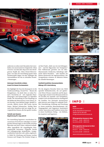 Autonews t%u00e4glich auf newsroom.kues.de 23RUND UMS FAHRENauf den Punkt: %u201eSieht aus wie ein Schlangennest %u2013 und die Abgasrohre wie Trompeten.%u201c Eine Hallenwand, gestaltet wie ein %u00fcberdimensionaler Setzkasten, beherbergt zahlreiche Motor-Rarit%u00e4ten %u2013 jede einzelne ein kleines Kunstwerk der Ingenieurskunst. Die Garagenboxen erinnern an Miniatur-Heime f%u00fcr schnelle Rennwagen.Familienfreundliches Museumserlebnis: Bildung trifft UnterhaltungF%u00fcr die j%u00fcngsten Besucher bietet das NAM spezielle Erlebnisbereiche, die auf spielerische Weise Wissen vermitteln und f%u00fcr Spannung sorgen. Damit ist das Museum nicht nur ein Paradies f%u00fcr Sammler und Technikfans, sondern auch ein lohnenswertes Ausflugsziel f%u00fcr Familien. Das Nationale Automuseum geht bewusst neue Wege: Es verbindet Technik, Unterhaltung, Schulung und Forschung zu einem modernen Museumskonzept, das Vergangenheit und Gegenwart harmonisch vereint. Innovation und Tradition treten hier in einen fruchtbaren Dialog %u2013 ein Erlebnis, das inspiriert und begeistert.anderswo zu sehen sind. Besonders hervorzuheben: ein unrestauriertes Original der %u00bbBenz Victoria%u00ab aus dem Jahr 1895 sowie eine detailgetreue Replik des %u00bbBenz Patent-Motorwagens%u00ab von 1896. Die Ausstellung spannt einen faszinierenden Bogen von den Anf%u00e4ngen des Automobilbaus bis hin zu aktuellen Formel1-Rennwagen.Motorsport-Geschichte erleben: Grand Prix Ikonen live bewundernEin Highlight f%u00fcr Fans des Rennsports ist die Sonderausstellung %u00bbGrand Prix %u2013 Ikonen der K%u00f6nigsklasse%u00ab. Sie deckt %u00fcber 100 Jahre Formel-1-Geschichte ab %u2013 mit originalen Rennfahrzeugen und Erinnerungen an legend%u00e4re Duelle. Die Ausstellung ist eine Hommage an die Helden des Motorsports: Louis Chiron, Tazio Nuvolari, Juan Manuel Fangio, Rudolf Caracciola, Alberto Ascari, Niki Lauda, Ayrton Senna, Michael Schumacher, Stirling Moss und Lewis Hamilton sind nur einige der unvergesslichen Namen, die hier geehrt werden.Technik zum Staunen: Begeisterung f%u00fcr Jung und AltDie Ausstellung begeistert verschiedene Generationen: Erwachsene schwelgen in nostalgischen Erinnerungen an die Duelle zwischen Mercedes und Auto Union, w%u00e4hrend technikaffine Jugendliche die ausgekl%u00fcgelte Fahrzeugtechnik bestaunen. Originelle Details wie schlangenartige Auspuffrohre, trompeten%u00e4hnliche Endrohre oder au%u00dfen angebrachte Hebel f%u00fcr Schaltung und Bremse wecken Staunen und Neugier. Ein Student bringt es NAMMuseumsstra%u00dfe 135716 Dietzh%u00f6lztal-EwersbachTelefon 02774 923 650info@nationalesautomuseum.de%u00d6ffnungszeiten Museum & ShopMi bis Fr 11:00 - 18:00 UhrSa und So 10:30 - 18:00 Uhr%u00d6ffnungszeiten Restaurant & DinerMo und Di RuhetagMi bis Fr 11:00 - 22:00 UhrSa und So 10:00 - 22:00 Uhrwww.nationalesautomuseum.deINFO
