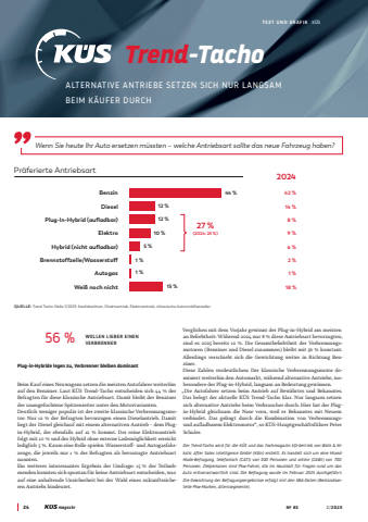 24 %u2116 83 2 /2025RUND UMS FAHRENQUELLE: Trend Tacho Welle 1/2025: Kaufabsichten, Direktvertrieb, Elektroantrieb, chinesische AutomobilherstellerBenzinDieselPlug-In-Hybrid (aufladbar)ElektroHybrid (nicht aufladbar)Brennstoffzelle/WasserstoffAutogasWei%u00df noch nichtWenn Sie heute Ihr Auto ersetzen m%u00fcssten %u2013 welche Antriebsart sollte das neue Fahrzeug haben?44 %12 %12 %10 %5 %1 %1 %15 %202442 %14 %8 %9 %6 %2 %1 %18 %27 %(2024: 23 %)Pr%u00e4ferierte AntriebsartALTERNATIVE ANTRIEBE SETZEN SICH NUR LANGSAM BEIM K%u00c4UFER DURCHTrend-TachoTEXT UND GRAFIK K%u00dcS56 % WOLLEN LIEBER EINEN VERBRENNERBeim Kauf eines Neuwagens setzen die meisten Autofahrer weiterhin auf den Benziner. Laut K%u00dcS Trend-Tacho entscheiden sich 44 % der Befragten f%u00fcr diese klassische Antriebsart. Damit bleibt der Benziner der unangefochtene Spitzenreiter unter den Motorvarianten.Deutlich weniger popul%u00e4r ist der zweite klassische Verbrennungsmotor: Nur 12 % der Befragten bevorzugen einen Dieselantrieb. Damit liegt der Diesel gleichauf mit einem alternativen Antrieb %u2013 dem Plugin-Hybrid, der ebenfalls auf 12 % kommt. Der reine Elektroantrieb folgt mit 10 % und der Hybrid ohne externe Ladem%u00f6glichkeit erreicht lediglich 5 %. Kaum eine Rolle spielen Wasserstoff- und Autogasfahrzeuge, die jeweils nur 1 % der Befragten als bevorzugte Antriebsart nannten.Ein weiteres interessantes Ergebnis der Umfrage: 15 % der Teilnehmenden konnten sich spontan f%u00fcr keine Antriebsart entscheiden, was auf eine anhaltende Unsicherheit bei der Wahl eines zukunftssicheren Antriebs hindeutet.Verglichen mit dem Vorjahr gewinnt der Plug-in-Hybrid am meisten an Beliebtheit: W%u00e4hrend 2024 nur 8 % diese Antriebsart bevorzugten, sind es 2025 bereits 12 %. Die Gesamtbeliebtheit der Verbrennungsmotoren (Benziner und Diesel zusammen) bleibt mit 56 % konstant. Allerdings verschiebt sich die Gewichtung weiter in Richtung Benziner.Diese Zahlen verdeutlichen: Der klassische Verbrennungsmotor dominiert weiterhin den Automarkt, w%u00e4hrend alternative Antriebe, insbesondere der Plug-in-Hybrid, langsam an Bedeutung gewinnen.%u201eDie Autofahrer setzen beim Antrieb auf Bew%u00e4hrtes und Bekanntes. Das belegt der aktuelle K%u00dcS Trend-Tacho klar. Nur langsam setzen sich alternative Antriebe beim Verbraucher durch. Hier hat der Plugin-Hybrid gleichsam die Nase vorn, weil er Bekanntes mit Neuem verbindet. Das gelingt durch die Kombination von Verbrennungsund aufladbarem Elektromotor%u201c, so K%u00dcS-Hauptgesch%u00e4ftsf%u00fchrer Peter Schuler.Der Trend-Tacho wird f%u00fcr die K%u00dcS und das Fachmagazin kfz-betrieb von Wolk & Nikolic After Sales Intelligence GmbH (K%u00f6ln) erstellt. Es handelt sich um eine MixedMode-Befragung, telefonisch (CATI) von 300 Personen und online (CAWI) von 700 Personen. Zielpersonen sind Pkw-Fahrer, die im Haushalt f%u00fcr Fragen rund um das Auto mitverantwortlich sind. Die Befragung wurde im Februar 2025 durchgef%u00fchrt. Die Gewichtung der Befragungsergebnisse erfolgt mit den KBA-Daten (Bestandsanteile Pkw-Marken, Alterssegmente).Plug-in-Hybride legen zu, Verbrenner bleiben dominant