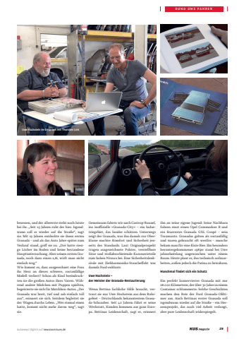 Autonews t%u00e4glich auf newsroom.kues.de 29RUND UMS FAHRENbesessen, und der allererste steht noch heute bei ihr. %u201eSeit 23 Jahren ruht der hier. Irgendwann soll er wieder auf die Stra%u00dfe%u201c, sagt sie. Mit 19 Jahren entdeckte sie ihren ersten Granada %u2013 und als das Auto Jahre sp%u00e4ter zum Verkauf stand, griff sie zu. %u201eDer hatte riesige L%u00f6cher im Boden und keine bestandene Hauptuntersuchung. Aber seinen ersten Granada, noch dazu einen 2,8i, wirft man nicht einfach weg.%u201cWie kommt es, dass ausgerechnet eine Frau ihr Herz an dieses schwere, rostanf%u00e4lligeModell verliert? Schon als Kind beeindruckten sie die gro%u00dfen Autos ihres Vaters. W%u00e4hrend andere M%u00e4dchen mit Puppen spielten, begeisterte sie sich f%u00fcr Matchbox-Autos. %u201eDer Granada war breit, tief und sah einfach toll aus%u201c, erinnert sie sich. Seitdem begleitet sie der Wagen durchs Leben. %u201eWer einmal einen hatte, kommt nicht mehr davon weg%u201c, sagt sie. Gemeinsam fahren wir nach Castrop-Rauxel, ins inoffizielle %u00bbGranada-City%u00ab %u2013 ein Industriegebiet, das Insider sch%u00e4tzen. Unterwegs zeigt der Granada, was ihn damals zur Oberklasse machte: Komfort und Sicherheit jenseits des Standards. Laut Originalprospekt trugen ausgezeichnete Polster, verstellbare Sitze und sto%u00dfabsorbierende Karosserieteile zum hohen Niveau bei. Eine Sicherheitslenks%u00e4ule mit Ziehharmonika-Staucheffekt war damals Ford-exklusiv.Uwe Hochstein %u2013 der Meister der Granada-RestaurierungWenn Bettina fachliche Hilfe braucht, vertraut sie nur Uwe Hochstein aus dem Ruhrgebiet %u2013 Deutschlands bekanntestem Granada-Schrauber. Seit 40 Jahren f%u00fchrt er seine Werkstatt, Kunden kommen aus ganz Europa. Bettinas Leidenschaft, sagt er, erinnert ihn an seine eigene Jugend: Seine Nachbarn fuhren einst einen Opel Commodore B und ein feuerrotes Granada GXL Coup%u00e9 %u2013 sein Traumauto. Granadas galten als rostanf%u00e4llig und waren gebraucht oft wertlos %u2013 manche bekam man f%u00fcr eine Kiste Bier. Ein besonders heruntergekommener 1985er stand bei Uwe jahrzehntelang ungewaschen unter einem Baum. Heute plant er, ihn technisch aufzuarbeiten, au%u00dfen jedoch die Patina zu bewahren.Manchmal findet sich ein SchatzEin perfekt konservierter Granada mit nur 28.000 Kilometern, der %u00fcber 30 Jahre in einem Container schlummerte: Solche Geschichten machen den Reiz der Ford Granada-Oldtimer aus. Auch Bettinas erster Granada soll irgendwann wieder auf die Stra%u00dfe %u2013 ein Herzensprojekt, das noch viel Arbeit verlangt, aber pure Leidenschaft widerspiegelt.Uwe Hochstein im Gespr%u00e4ch mit Thorsten Link