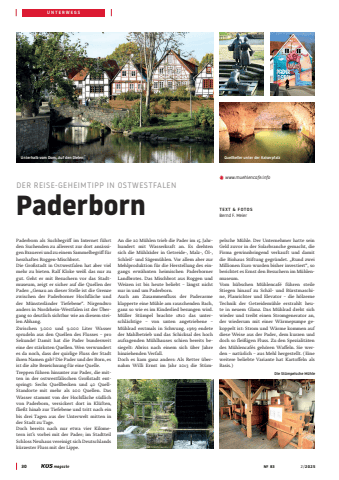 30 %u2116 83 2 /2025UNTERWEGSPaderbornPaderborn als Suchbegriff im Internet f%u00fchrt den Suchenden zu allererst zur dort ans%u00e4ssigen Brauerei und zu einem Sammelbegriff f%u00fcr herzhaftes Roggen-Mischbrot.Die Gro%u00dfstadt in Ostwestfalen hat aber viel mehr zu bieten. Ralf Kloke wei%u00df das nur zu gut. Geht er mit Besuchern vor das Stadtmuseum, zeigt er sicher auf die Quellen der Pader: %u201eGenau an dieser Stelle ist die Grenze zwischen der Paderborner Hochfl%u00e4che und der M%u00fcnsterl%u00e4nder Tiefebene%u201c. Nirgendwo anders in Nordrhein-Westfalen ist der %u00dcbergang so deutlich sichtbar wie an diesem steilen Abhang.Zwischen 3.000 und 9.000 Liter Wasser sprudeln aus den Quellen des Flusses %u2013 pro Sekunde! Damit hat die Pader bundesweit eine der st%u00e4rksten Quellen. Wen verwundert es da noch, dass der quirlige Fluss der Stadt ihren Namen gab? Die Pader und der Born, es ist die alte Bezeichnung f%u00fcr eine Quelle.Treppen f%u00fchren hinunter zur Pader, die mitten in der ostwestf%u00e4lischen Gro%u00dfstadt entspringt: Sechs Quellbecken und 40 QuellStandorte mit mehr als 200 Quellen. Das Wasser stammt von der Hochfl%u00e4che s%u00fcdlich von Paderborn, versickert dort in Kl%u00fcften, flie%u00dft hinab zur Tiefebene und tritt nach ein bis drei Tagen aus der Unterwelt mitten in der Stadt zu Tage.Doch bereits nach nur etwa vier Kilometern ist%u2019s vorbei mit der Pader; im Stadtteil Schloss Neuhaus vereinigt sich Deutschlands k%u00fcrzester Fluss mit der Lippe. pelsche M%u00fchle. Der Unternehmer hatte sein Geld zuvor in der Solarbranche gemacht, die Firma gewinnbringend verkauft und damit die Biohaus Stiftung gegr%u00fcndet. %u201eRund zwei Millionen Euro wurden bisher investiert%u201c, so berichtet es Ernst den Besuchern im M%u00fchlenmuseum.Vom h%u00fcbschen M%u00fchlencaf%u00e9 f%u00fchren steile Stiegen hinauf zu Sch%u00e4l- und B%u00fcrstmaschine, Planrichter und Elevator %u2013 die h%u00f6lzerne Technik der Getreidem%u00fchle erstrahlt heute in neuem Glanz. Das M%u00fchlrad dreht sich wieder und treibt einen Stromgenerator an, der wiederum mit einer W%u00e4rmepumpe gekoppelt ist: Strom und W%u00e4rme kommen auf diese Weise aus der Pader, dem kurzen und doch so flei%u00dfigen Fluss. Zu den Spezialit%u00e4ten des M%u00fchlencaf%u00e9s geh%u00f6ren Waffeln. Sie werden %u2013 nat%u00fcrlich %u2013 aus Mehl hergestellt. (Eine weitere beliebte Variante hat Kartoffeln als Basis.)TEXT & FOTOSBernd F. Meier An die 20 M%u00fchlen trieb die Pader im 15. Jahrhundert mit Wasserkraft an. Es drehten sich die M%u00fchlr%u00e4der in Getreide-, Malz-, %u00d6l-, Schleif- und S%u00e4gem%u00fchlen. Vor allem aber zur Mehlproduktion f%u00fcr die Herstellung des eingangs erw%u00e4hnten heimischen Paderborner Landbrotes. Das Mischbrot aus Roggen und Weizen ist bis heute beliebt %u2013 l%u00e4ngst nicht nur in und um Paderborn.Auch am Zusammenfluss der Paderarme klapperte eine M%u00fchle am rauschenden Bach,ganz so wie es im Kinderlied besungen wird. M%u00fcller St%u00fcmpel brachte 1810 das unterschl%u00e4chtige %u2013 von unten angetriebene %u2013 M%u00fchlrad erstmals in Schwung. 1969 endete der Mahlbetrieb und das Schicksal des hoch aufragenden M%u00fchlhauses schien bereits besiegelt: Abriss nach einem sich %u00fcber Jahre hinziehenden Verfall.Doch es kam ganz anders: Als Retter %u00fcbernahm Willi Ernst im Jahr 2013 die St%u00fcmDER REISE-GEHEIMTIPP IN OSTWESTFALENUnterhalb vom Dom, Auf den Dielen Quellkeller unter der KaiserpfalzDie St%u00fcmpelsche M%u00fchleHand-Paper www.muehlencafe.info