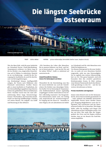 Autonews t%u00e4glich auf newsroom.kues.de 31UNTERWEGSTEXT Editha Weber FOTOS picture alliance/dpa Zentralbild (Stefan Sauer, Stephan Schulz) Er%u00f6ffnung Seebr%u00fccke PrerowDie l%u00e4ngste Seebr%u00fccke im OstseeraumWer das Meer liebt, wird die neue Seebr%u00fccke im Ostseebad Prerow (Dar%u00df/MecklenburgVorpommern) sch%u00e4tzen: 720 Meter lang ist die im Oktober 2024 eingeweihte Konstruktion auf 87 Pf%u00e4hlen. In mehrfacher Hinsicht ist sie von Bedeutung %u2013 sowohl f%u00fcr die Versorgung des Inselhafens als auch f%u00fcr den Einsatz von Rettungsfahrzeugen.Am Br%u00fcckenkopf k%u00f6nnen Ausflugsschiffe anlegen, die Touren nach Hiddensee oder D%u00e4nemark unternehmen. Dar%u00fcber hinaus gibt es einen Inselhafen in Tropfenform, der mit dreiunddrei%u00dfig Liegepl%u00e4tzen Sportbooten Schutz bei gef%u00e4hrlichen Wetterverh%u00e4ltnissen bietet. Startklar wartet hier der rund achtundzwanzig Meter lange Seenotrettungskreuzer %u00bbNis Randers%u00ab der Deutschen Gesellschaft zur Rettung Schiffbr%u00fcchiger (DGzRS) auf seinen Einsatz. Die Aufgabe von Schiff und Besatzung ist klar definiert:%u201eWir bewahren das Leben aller Menschen, die in unseren Gebieten von Nord- und Ostsee in Seenot geraten %u2013 rund um die Uhr und bei jedem Wetter%u201c, hei%u00dft es einleitend auf seenotretter.de.Umweltfreundlicher Neubau: Schutz f%u00fcr Nationalpark und NaturWesentlich f%u00fcr die Entscheidung zum Bau der neuen Seebr%u00fccke war auch der Umweltschutz: Die Zufahrt zum ehemaligen Nothafen Dar%u00dfer Ort im Nationalpark Vorpommersche Boddenlandschaft musste regelm%u00e4%u00dfig ausgebaggert werden. Inzwischen ist das Gebiet vollst%u00e4ndig renaturiert. Das Baugeschehen dokumentiert damit auch, wie wichtig und anspruchsvoll ein verantwortungsvoller Umgang mit der Natur ist %u2013 besonders in einer Region, die seit Jahrzehnten ein beliebtes Urlaubsziel und f%u00fcr viele Menschen erste Wahl f%u00fcr Badekuren ist.Vor diesem Hintergrund ist die neue Seebr%u00fccke, vor mehr als 5.000 Besuchern feierlich eingeweiht, nicht nur eine Notwendigkeit: Sie ist zugleich eine weitere Sehensw%u00fcrdigkeit vor Ort. Wer gerne bummelt, wird sich besonders %u00fcber den attraktiv gestalteten Br%u00fcckenvorplatz freuen. Er f%u00fchrt entlang einer kleinen Flaniermeile durch den K%u00fcstenwald geradewegs in den Ort %u2013 und der hat weitere Attraktionen zu bieten. Prero Geschichte und GegenwartImmer einen Besuch wert ist die Seemannskirche, deren Inneres festlich geschm%u00fcckt ist %u2013 unter anderem mit Modellen historischer Segelschiffe. Prerow bietet dar%u00fcber hinaus gute Shopping-M%u00f6glichkeiten sowie die Gelegenheit, den Leuchtturm und das Naturmuseum Dar%u00dfer Ort zu besuchen. Wer l%u00e4nger bleibt, sollte f%u00fcr Ausfl%u00fcge auch Zingst und Ahrenshoop auf den Urlaubsplan setzen. Last but not least: Wer mehr %u00fcber die Vergangenheit des Ortes und der Region erfahren m%u00f6chte, dem sei ein Besuch des Dar%u00df-Museums empfohlen.