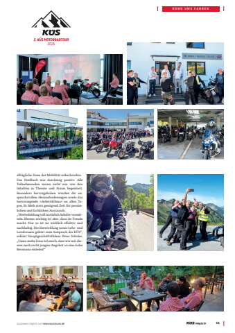 Autonews t%u00e4glich auf newsroom.kues.de 11RUND UMS FAHRENallt%u00e4gliche Form der Mobilit%u00e4t n%u00e4herbrachte.Das Feedback war durchweg positiv: Alle Teilnehmenden waren nicht nur von den Inhalten in Theorie und Praxis begeistert. Besonders hervorgehoben wurden die anspruchsvollen Herausforderungen sowie das hervorragende %u00bbArbeitsklima%u00ab an allen Tagen. Es blieb stets gen%u00fcgend Zeit f%u00fcr pers%u00f6nlichen und fachlichen Austausch. %u201eWeiterbildung soll nat%u00fcrlich Inhalte vermitteln. Ebenso wichtig ist aber, dass sie Freude macht. Nur so ist sie wirklich effektiv und nachhaltig. Die Entwicklung neuer Lehr- und Lernformen geh%u00f6rt zum Anspruch der K%u00dcS%u201c, erkl%u00e4rt Hauptgesch%u00e4ftsf%u00fchrer Peter Schuler. %u201eUmso mehr freue ich mich, dass wir mit diesem noch recht jungen Angebot so eine hohe Resonanz erzielen!%u201c