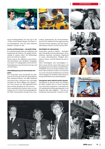 Autonews t%u00e4glich auf newsroom.kues.de 23MOTORSPORTciation), Repr%u00e4sentant der Presse-Kommission der FIA, arbeitete f%u00fcr die Agenturen dpa (Deutsche Presse-Agentur), den SID (SportInformations-Dienst), f%u00fcr RTL und das ZDF.Vielseitigkeit als LebensprinzipDazwischen schrieb er B%u00fccher %u2013 Bestseller %u00fcber Automobile und den Motorsport, die in mehreren Sprachen erschienen. Erg%u00e4nzend zu seiner journalistischen T%u00e4tigkeit %u00fcbernahm er Presse- und PR-Arbeiten f%u00fcr die Industrie.Seine Vielseitigkeit und Umtriebigkeit erkl%u00e4rt er ganz einfach: %u201eSport, Motorsport und Bewegung waren stets meine Antriebsfedern. Schlie%u00dflich war ich auch darin erblich vorbelastet: Mein Gro%u00dfvater Arthur von Osterroth war erster Deutscher Rodelmeister im Einzel und im Doppel. Die Schlitten stehen heute in Georg Hackls Museum in Berchtesgaden.%u201cUnvergessen: Mario Andretti und die TomatenUnvergessen ist ihm bis heute ein Erlebnis, als Mario Andretti ihn zu Hause besuchte: Von Osterroths Gro%u00dfmutter verwickelte die US-amerikanische Motorsportlegende in ein Gespr%u00e4ch %u00fcber alles M%u00f6gliche %u2013 %u201ebis hin zur heimischen Tomatenzucht%u201c, erinnert er sich.neuen Pershing-Rekord auf und traf in der %u00bbWhite Sands Missile Range%u00ab die Fl%u00e4che eines Tennisplatzes. %u201eDas war mein sch%u00f6nstes Erlebnis%u201c, erinnert er sich.Karriere, Entt%u00e4uschungen %u2013 und gro%u00dfe ErfolgeEr verlie%u00df die Bundeswehr als Staffelchef und Hauptmann der Reserve. Die gr%u00f6%u00dfte Entt%u00e4uschung in seinem Leben: Als Brillentr%u00e4ger galt er als nicht Jet-tauglich.Jochen stieg in der Redaktion zum Ressortchef Motorsport auf. Ber%u00fchmte Fotografen wie Rainer W. Schlegelmilch und Ferdi Kr%u00e4ling begleiteten seine Berichterstattung rund um den Globus. Atlantik%u00fcberquerung und internationale AufgabenVon Osterroths erstes Automobil war %u00fcbrigens ein Porsche 356 B. Mit der Aquila Marina, dem Dreimast-Schoner von Mike Hailwood und Jochen Mass, %u00fcberquerte der umtriebige Journalist als Ersatz-Skipper den Atlantik %u2013 von Gran Canaria aus. Ein Segelunfall hatte Mass in H%u00f6he Marokkos das Aus beschert.Seine journalistische Karriere setzte er konsequent fort: Er wurde Vorstandsmitglied in der IRPA (International Racing Press Asso-