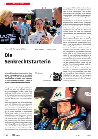 26 %u2116 84 3/2025MOTORSPORTINSTAGRAM _claaire_s2024 gewann sie den Berg Cup (KW), der damals vor allem von Experten und Insidern wahrgenommen wurde. Schon 2025, nur knapp ein Jahr sp%u00e4ter, sicherte sie sich als Gewinnerin einer weltweiten F%u00f6rderausschreibung des Internationalen Motorsportverbands IAF die Junior Rallye-Weltmeisterschaft.Gegen eine Vielzahl von Mitbewerberinnen setzte sich Sch%u00f6nborn hier souver%u00e4n durch. Ohne jemals zuvor eine Rallye gefahren zu sein, hatte sie sich 2024 f%u00fcr das Young Driver%u2019s F%u00f6rderprogramm der World Rally Championship f%u00fcr Frauen beworben. Zu ihrer eigenen %u00dcberraschung landete sie unter den besten 15 Kandidatinnen und wurde zum weiteren Auswahlverfahren nach Polen eingeladen. Dort schaffte sie den Sprung unter die besten drei %u2013 und dann ging alles fast wie von selbst.Bei ihrer dritten Rallye, dem deutschen WMLauf CER, qualifizierte sie sich f%u00fcr den Lauf in Schweden, also f%u00fcr das Finale des F%u00f6rderprogramms f%u00fcr Frauen. Dort setzte sie sich bei ihrer ersten Fahrt auf Schnee und Eis gegen die einzige verbliebene Mitbewerberin durch.Im Mai bestritt sie in Portugal ihren ersten Lauf im WRC Young Driver Team im Rahmen des Schotter-Klassikers an der Algarve. Dabei standen weniger das Ergebnis als vielmehr das Erlebnis und die Erfahrung im Vordergrund. Der Einstieg ins internationale Gesch%u00e4ft war ebenso hart wie beeindruckend: Nach einem fr%u00fchen %u00bbSchreckensmoment mit einer Rolle%u00ab konnten die Mechaniker ihren Ford Fiesta Rally3 Evo wieder reparieren. Am zweiten Tag k%u00e4mpfte sie sich mit Mut, Moral und K%u00f6nnen zur%u00fcck und nahm der Konkurrenz Zehntelsekunde um Zehntelsekunde wieder ab.%u201eDas war eine unglaubliche und erwartungsgem%u00e4%u00df Monster-Aufgabe. Dass es aber so hart werden w%u00fcrde, damit hatte ich ehrlich gesagt nicht gerechnet. Ich bin %u00fcbergl%u00fccklich, dass wir uns nach dem fr%u00fchen Missgeschick zur%u00fcckk%u00e4mpfen konnten.%u201cInzwischen ist Claire Sch%u00f6nborn als Senkrechtstarterin tats%u00e4chlich eine feste Gr%u00f6%u00dfe in der Rallyeszene. Bei der regionalen Hunsr%u00fcck Junior Rallye in ihrer Heimat absolvierte sie einige PR-Starts als Vorauswagenfahrerin in einem Toyota GR Yaris. Zu den G%u00e4sten geh%u00f6rte Bundestagspr%u00e4sidentin Julia Kl%u00f6ckner als Mitfahrerin. Diese gab der n%u00e4chsten Frau auf dem Beifahrersitz einen kleinen Tipp mit auf den Weg: %u201eWenn dir mulmig wird, einfach nach unten gucken.%u201cIhr Bekenntnis zu Rheinland-Pfalz und zum Hunsr%u00fcck als ihrer Heimat hat sie bereits mit einem Plan f%u00fcr 2027 verbunden: %u201eDann komme ich zur%u00fcck zur Hunsr%u00fcck Junior %u2013 aber als Teilnehmerin und nicht im Vorauswagen. Das sind so tolle Wertungspr%u00fcfungen hier, die muss man einfach auch mal im Wettbewerbstempo fahren.%u201cDie SenkrechtstarterinCLAIRE SCH%u00d6NBORNIm Day Job ist sie Systemingenieurin bei einem gro%u00dfen Technologiekonzern. In der Freizeit aber gelang es ihr, die gesamte Rallye-Welt quasi im Sturm zu erobern: Claire Sch%u00f6nborn ist eine echte Senkrechtstarterin %u2013 und das ist in ihrem Fall keineswegs eine %u00dcbertreibung.TEXT & FOTOS J%u00fcrgen C. BraunWeitere Infos