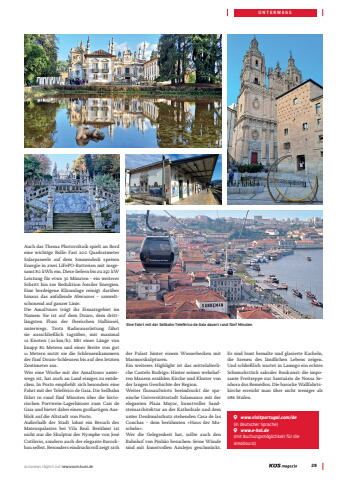 Autonews t%u00e4glich auf newsroom.kues.de 29UNTERWEGSAuch das Thema Photovoltaik spielt an Bord eine wichtige Rolle: Fast 200 Quadratmeter Solarpaneele auf dem Sonnendeck speisen Energie in zwei LiFePO-Batterien mit insgesamt 80 kWh ein. Diese liefern bis zu 250 kW Leistung f%u00fcr etwa 30 Minuten %u2013 ein weiterer Schritt hin zur Reduktion fossiler Energien. Eine bordeigene Kl%u00e4ranlage reinigt dar%u00fcber hinaus das anfallende Abwasser %u2013 umweltschonend auf ganzer Linie.Die AmaDouro tr%u00e4gt ihr Einsatzgebiet im Namen: Sie ist auf dem Douro, dem drittl%u00e4ngsten Fluss der Iberischen Halbinsel, unterwegs. Trotz Radarausr%u00fcstung f%u00e4hrt sie ausschlie%u00dflich tags%u00fcber, mit maximal 12 Knoten (22 km/h). Mit einer L%u00e4nge von knapp 80 Metern und einer Breite von gut 11 Metern nutzt sie die Schleusenkammern der f%u00fcnf Douro-Schleusen bis auf den letzten Zentimeter aus.Wer eine Woche mit der AmaDouro unterwegs ist, hat auch an Land einiges zu entdecken. In Porto empfiehlt sich besonders eine Fahrt mit der Telef%u00e9rico de Gaia. Die Seilbahn f%u00fchrt in rund f%u00fcnf Minuten %u00fcber die historischen Portwein-Lagerh%u00e4user zum Cais de Gaia und bietet dabei einen gro%u00dfartigen Ausblick auf die Altstadt von Porto.Au%u00dferhalb der Stadt lohnt ein Besuch des Mateuspalastes bei Vila Real. Ber%u00fchmt ist nicht nur die Skulptur der Nymphe von Jos%u00e9 Cutilerio, sondern auch der elegante Barockbau selbst. Besonders eindrucksvoll zeigt sich der Palast hinter einem Wasserbecken mit Marmorskulpturen.Ein weiteres Highlight ist das mittelalterliche Castelo Rodrigo: Hinter seinen wehrhaften Mauern erz%u00e4hlen Kirche und Kloster von der langen Geschichte der Region.Weiter flussaufw%u00e4rts beeindruckt die spanische Universit%u00e4tsstadt Salamanca mit der eleganten Plaza Mayor, kunstvoller Sandsteinarchitektur an der Kathedrale und dem unter Denkmalschutz stehenden Casa de las Conchas %u2013 dem ber%u00fchmten %u00bbHaus der Muscheln%u00ab.Wer die Gelegenheit hat, sollte auch den Bahnhof von Pinh%u00e3o besuchen: Seine W%u00e4nde sind mit kunstvollen Azulejos geschm%u00fcckt. Es sind bunt bemalte und glasierte Kacheln, die Szenen des l%u00e4ndlichen Lebens zeigen. Und schlie%u00dflich wartet in Lamego ein echtes Schmuckst%u00fcck sakraler Baukunst: die imposante Freitreppe zur Santu%u00e1rio de Nossa Senhora dos Rem%u00e9dios. Die barocke Wallfahrtskirche erreicht man %u00fcber nicht weniger als 686 Stufen.Eine Fahrt mit der Seilbahn Telef%u00e9rico de Gaia dauert rund f%u00fcnf MinutenMAP-MARKER-ALT www.visitportugal.com/de (in deutscher Sprache)MAP-MARKER-ALT www.e-hoi.de (mit Buchungsm%u00f6glichkeit f%u00fcr die AmaDouro)