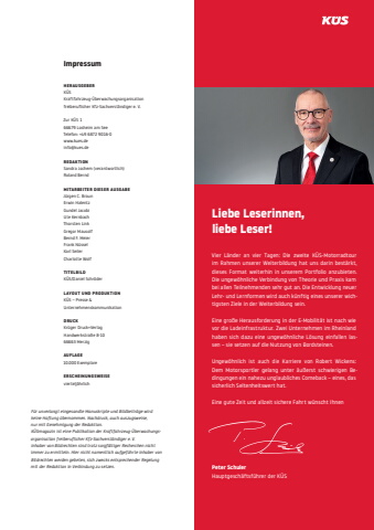 Liebe Leserinnen, liebe Leser!Vier L%u00e4nder an vier Tagen: Die zweite K%u00dcS-Motorradtour im Rahmen unserer Weiterbildung hat uns darin best%u00e4rkt, dieses Format weiterhin in unserem Portfolio anzubieten. Die ungew%u00f6hnliche Verbindung von Theorie und Praxis kam bei allen Teilnehmenden sehr gut an. Die Entwicklung neuer Lehr- und Lernformen wird auch k%u00fcnftig eines unserer wichtigsten Ziele in der Weiterbildung sein.Eine gro%u00dfe Herausforderung in der E-Mobilit%u00e4t ist nach wie vor die Ladeinfrastruktur. Zwei Unternehmen im Rheinland haben sich dazu eine ungew%u00f6hnliche L%u00f6sung einfallen lassen %u2013 sie setzen auf die Nutzung von Bordsteinen.Ungew%u00f6hnlich ist auch die Karriere von Robert Wickens: Dem Motorsportler gelang unter %u00e4u%u00dferst schwierigen Bedingungen ein nahezu unglaubliches Comeback %u2013 eines, das sicherlich Seltenheitswert hat.Eine gute Zeit und allzeit sichere Fahrt w%u00fcnscht IhnenPeter SchulerHauptgesch%u00e4ftsf%u00fchrer der K%u00dcSImpressumHERAUSGEBERK%u00dcS Kraftfahrzeug-%u00dcberwachungsorganisation freiberuflicher Kfz-Sachverst%u00e4ndiger e. V.Zur K%u00dcS 166679 Losheim am SeeTelefon: +49 6872 9016-0www.kues.deinfo@kues.deREDAKTIONSandra Jochem (verantwortlich)Roland BerndMITARBEITER DIESER AUSGABEJ%u00fcrgen C. BraunErwin HalentzGundel JacobiUte KernbachThorsten LinkGregor MausolfBernd F. MeierFrank N%u00fcsselKarl SeilerCharlotte WolfTITELBILDK%u00dcS/Daniel Schr%u00f6derLAYOUT UND PRODUKTIONK%u00dcS %u2013 Presse & UnternehmenskommunikationDRUCKKr%u00fcger Druck+VerlagHandwerkstra%u00dfe 8-1066663 MerzigAUFLAGE10.000 ExemplareERSCHEINUNGSWEISEviertelj%u00e4hrlichF%u00fcr unverlangt eingesandte Manuskripte und Bildbeitr%u00e4ge wird keine Haftung %u00fcbernommen. Nachdruck, auch auszugsweise,nur mit Genehmigung der Redaktion.K%u00dcSmagazin ist eine Publikation der Kraftfahrzeug-%u00dcberwachungsorganisation freiberuflicher Kfz-Sachverst%u00e4ndiger e. V. Inhaber von Bildrechten sind trotz sorgf%u00e4ltiger Recherchen nicht immer zu ermitteln. Hier nicht namentlich aufgef%u00fchrte Inhaber von Bildrechten werden gebeten, sich zwecks entsprechender Regelung mit der Redaktion in Verbindung zu setzen.