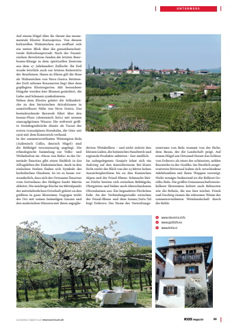 Autonews t%u00e4glich auf newsroom.kues.de 33UNTERWEGSAuf einem H%u00fcgel %u00fcber ihr thront das monumentale Kloster Kostanjevica. Von diesem kulturellen Wahrzeichen aus er%u00f6ffnet sich ein weiter Blick %u00fcber die grenz%u00fcberschreitende Kulturhauptstadt. Nach der Franz%u00f6sischen Revolution fanden die letzten Bourbonen-K%u00f6nige in dem spirituellen Zentrum aus dem 17. Jahrhundert Zuflucht. Ihr Exil wurde letztlich auch zur letzten Ruhest%u00e4tte der Bourbonen. Ihnen zu Ehren gilt die Rose als Wahrzeichen von Nova Gorica. Bet%u00f6render Duft seltener Rosenarten liegt %u00fcber dem gepflegten Klostergarten. Mit besonderer Hingabe werden hier Blumen gez%u00fcchtet, die Liebe und Schmerz symbolisieren.Neben dem Kloster geh%u00f6rt die Solkanbr%u00fccke zu den historischen Attraktionen in unmittelbarer N%u00e4he von Nova Gorica. Das beeindruckende Bauwerk f%u00fchrt %u00fcber den Isonzo-Fluss (slowenisch So%u010da) mit seinem smaragdgr%u00fcnen Wasser. Die weltweit gr%u00f6%u00dfte Steinbogenbr%u00fccke diente als Trasse der ersten transalpinen Eisenbahn, die G%u00f6rz seit 1906 mit dem Kaiserreich verband.In der sonnenverw%u00f6hnten Weinregion Brda (italienisch Collio, deutsch H%u00fcgel) sind die Rebh%u00fcgel terrassenartig angelegt. Die ethnologische Sammlung zur Volks- und Wohnkultur im %u00bbHaus von Brda%u00ab in der Gemeinde %u0160martno gibt einen Einblick in das Alltagsleben der Einheimischen. Auch in den einfachen Stuben finden sich Symbole des katholischen Glaubens. So ist es kaum verwunderlich, dass sich der Ortsname %u0160martno vom Gotteshaus des Heiligen Sankt Martin ableitet. Die m%u00e4chtige Kirche im Mittelpunkt der mittelalterlichen Ortschaft geh%u00f6rt zu den gr%u00f6%u00dften in ganz Slowenien. Dagegen wirkt der Ort mit seinen heimeligen Gassen und den malerischen H%u00e4usern mit ihren angegliederten Weinkellern %u2013 und nicht zuletzt den kleinen L%u00e4den, die heimisches Handwerk und regionale Produkte anbieten %u2013 fast niedlich.Im nahegelegenen Gonja%u010de lohnt sich ein Aufstieg auf den Aussichtsturm. Bei klarer Sicht reicht der Blick von der 23 Meter hohen Aussichtsplattform bis zu den Karnischen Alpen und der Friaul-Ebene. Schmucke kleine D%u00f6rfer breiten sich zwischen Rebh%u00fcgeln, Obstg%u00e4rten und bisher noch %u00fcberschaubaren Olivenhainen aus. Ein begnadetes Fleckchen Erde. An der Verbindungsstra%u00dfe zwischen der Friaul-Ebene und dem Isonzo/So%u010da-Tal liegt Dobrovo. Der Name des Verwaltungszentrums von Brda stammt von der Eiche, dem Baum, der die Landschaft pr%u00e4gt. Auf einem H%u00fcgel am Ortsrand thront das Schloss von Dobrovo als eines der sch%u00f6nsten, noblen Bauwerke in der Gori%u0161ka. Im f%u00fcrstlich ausgestatteten Rittersaal haben sich verschiedene Adelsfamilien mit ihren Wappen verewigt. Nicht weniger bedeutend ist die Kellerei Gori%u0161ka Brda. Die gr%u00f6%u00dfte Genossenschaftsweinkellerei Sloweniens keltert auch Rebsorten wie die Rebula, die nur hier w%u00e4chst. Frisch und fruchtig rinnen die erlesenen Weine der sonnenverw%u00f6hnten Weinlandschaft durch die Kehle. DOT-CIRCLE www.slovenia.infoDOT-CIRCLE www.go2025.euDOT-CIRCLE www.brda.si