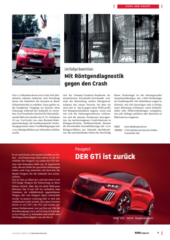 Autonews t%u00e4glich auf newsroom.kues.de 5KURZ UND KNAPPEr ist noch heute auf unseren Stra%u00dfen zu finden %u2013 und keineswegs allzu selten: In der Geschichte des Peugeot 205 nahm die GTi-Version eine besondere Rolle ein. Er begeisterte viele, die ein Faible f%u00fcr sportliche Kleinwagen haben, und trug seinerzeit viel dazu bei, die Marke Peugeot f%u00fcr die Zukunft neu auszurichten.Das ist fast 40 Jahre her, und mit dem E-208 GTi bringt Peugeot die Erinnerung an diese Zeiten zur%u00fcck. Aber das ist nicht blo%u00df pure Historie: Der E-208 GTi ist technisch eine Premiere, als vollelektrisch angetriebener Wagen, der von Peugeot Sport entwickelt wurde. In puncto Leistung h%u00e4lt er sich mit Ambitionen nicht zur%u00fcck: Als reiner Stromer leistet er 206 kW (280 PS) und wartet mit einem Drehmoment von 345 Nm auf. F%u00fcr die Beschleunigung von 0 auf 100 km/h ben%u00f6tigt er laut Peugeot 5,7 Sekunden und schafft eine H%u00f6chstgeschwindigkeit von 180 km/h.PeugeotDER GTi ist zur%u00fcckUnfallpr%u00e4ventionMit R%u00f6ntgendiagnostik gegen den CrashTEXT Auto-Medienportal.netFOTOS CTS/crashtest-service.com GmbH, Fraunhofer EMINur 0,1 Sekunden dauert ein Crash. Seit Jahrzehnten arbeiten Industrie und Forschung daran, die Sicherheit der Insassen in dieser Zehntelsekunde zu erh%u00f6hen. Dazu geh%u00f6rt es, die komplexen Vorg%u00e4nge im Inneren eines Fahrzeugs w%u00e4hrend des Aufpralls zu verstehen. Das Fraunhofer-Institut f%u00fcr Kurzzeitdynamik EMI setzt hierf%u00fcr das X-CC-Verfahren (X-ray CarCrash) ein, eine Kurzzeit-R%u00f6ntgentechnologie, die hochdynamische Verformungsprozesse unter Crashbedingungen mit 1.000 R%u00f6ntgenbildern pro Sekunden sichtbar macht.TEXT K%u00dcS FOTO Peugeot/StellantisAuf der Dummy-Crashtest-Konferenz demonstrierten Fraunhofer-Forschende erstmals die Entstehung solcher R%u00f6ntgenaufnahmen mit einem Versuch, bei dem ein Auto mit 27 km/h gegen einen Pfahl prallt. Die R%u00f6ntgenaufnahmen zeigten, wann und wie sich die Fahrzeugstrukturen verformten und die inneren Strukturen interagierten. Im institutseigenen Crash-Zentrum in Efringen-Kirchen, S%u00fcddeutschland, k%u00f6nnen die Forschenden Gesamtfahrzeuge mit 1.000 R%u00f6ntgen-Bildern pro Sekunde durchleuchten. Ein entscheidender Faktor f%u00fcr den Erfolg dieser Technologie ist der leistungsstarke Linearbeschleuniger mit 1-kHz-Technologie als Strahlenquelle. Die Aufnahmen zeigen in Echtzeit, wie sich Quertr%u00e4ger oder A-S%u00e4ulen unter Belastung verformen, wann Schwei%u00dfn%u00e4hte oder Klebeverbindungen nachgeben, wie sich Airbags entfalten oder Batterien in Elektroautos reagieren.