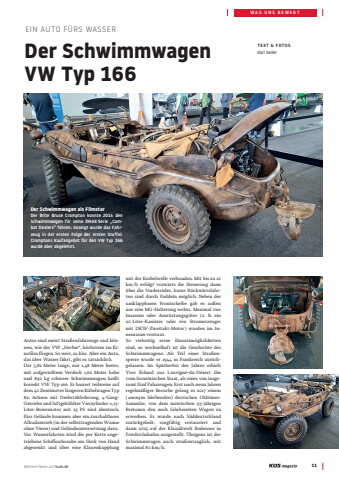 Weitere News auf kues.de 11WAS UNS BEWEGTDer Schwimmwagen VW Typ 166EIN AUTO F%u00dcRS WASSERTEXT & FOTOSKarl Seiler Autos sind meist Stra%u00dfenfahrzeuge und k%u00f6nnen, wie der VW %u201eHerbie%u201c, h%u00f6chstens im Kinofilm fliegen. So weit, so klar. Aber ein Auto, das %u00fcber Wasser f%u00e4hrt, gibt es tats%u00e4chlich.Der 3,82 Meter lange, nur 1,48 Meter breite, mit aufgestelltem Verdeck 1,62 Meter hohe und 890 kg schwere Schwimmwagen hei%u00dft korrekt VW Typ 166. Er basiert teilweise auf dem 40 Zentimeter l%u00e4ngeren K%u00fcbelwagen Typ 82: Achsen mit Drehstabfederung, 4-GangGetriebe und luftgek%u00fchlter Vierzylinder-1,13-Liter-Boxermotor mit 25 PS sind identisch, f%u00fcrs Gel%u00e4nde kommen aber ein zuschaltbarer Allradantrieb (in der selbsttragenden Wanne ohne T%u00fcren) und Gel%u00e4ndeuntersetzung dazu.Vor Wasserfahrten wird die per Kette angetriebene Schiffsschraube am Heck von Hand abgesenkt und %u00fcber eine Klauenkupplung mit der Kurbelwelle verbunden. Mit bis zu 10 km/h erfolgt vorw%u00e4rts die Steuerung dann %u00fcber die Vorderr%u00e4der, kurze R%u00fcckw%u00e4rtsfahrten sind durch Paddeln m%u00f6glich. Neben der umklappbaren Frontscheibe gab es au%u00dfen nur eine MG-Halterung rechts. Maximal vier Insassen oder Ausr%u00fcstungsg%u00fcter (z. B. ein 20-Liter-Kanister oder ein Stromerzeuger mit DKW-Zweitakt-Motor) wurden im Innenraum verstaut. So vielseitig seine Einsatzm%u00f6glichkeiten sind, so wechselhaft ist die Geschichte des Schwimmwagens: Als Teil einer Stra%u00dfensperre wurde er 1944 in Frankreich zur%u00fcckgelassen. Im Sp%u00e4therbst des Jahres erhielt Yves %u00c9chard aus Louvign%u00e9-du-D%u00e9sert ihn vom franz%u00f6sischen Staat, als eines von insgesamt f%u00fcnf Fahrzeugen. Erst nach neun Jahren regelm%u00e4%u00dfiger Besuche gelang es 2017 einem (anonym bleibenden) deutschen OldtimerSammler, von dem inzwischen 93-j%u00e4hrigen Bretonen den noch fahrbereiten Wagen zu erwerben. Er wurde nach S%u00fcddeutschland zur%u00fcckgeholt, sorgf%u00e4ltig restauriert und dann 2025 auf der Klassikwelt Bodensee in Friedrichshafen ausgestellt. %u00dcbrigens ist der Schwimmwagen auch stra%u00dfentauglich, mit maximal 80 km/h.Der Schwimmwagen als FilmstarDer Brite Bruce Crompton konnte 2014 den Schwimmwagen f%u00fcr seine DMAX-Serie %u201eCombat Dealers%u201c fahren. Gezeigt wurde das Fahrzeug in der ersten Folge der ersten Staffel. Cromptons Kaufangebot f%u00fcr den VW Typ 166 wurde aber abgelehnt.
