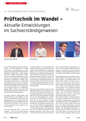 12 %u2116 85 4/2025RUND UMS FAHRENTEXT DIQFOTOS DIQ/Frank EpplerPr%u00fcftechnik im Wandel %u2013 Aktuelle Entwicklungenim Sachverst%u00e4ndigenwesenAutos sind heute gleichsam fahrbare Rechenzentren %u2013 vor allem aufgrund der Vielzahl automatisierter Assistenzsysteme. Immer mehr Systeme sind in Neufahrzeugen bereits gesetzlich vorgeschrieben, andere k%u00f6nnen beim Kauf optional hinzugew%u00e4hlt werden. Die Zahl der verf%u00fcgbaren Funktionen w%u00e4chst stetig. In ihrem komplexen Zusammenspiel technischer Komponenten er%u00f6ffnet diese Entwicklung gro%u00dfe Chancen %u2013 bringt jedoch auch Risiken mit sich. Und sie ist von gro%u00dfer Bedeutung f%u00fcr die Fahrzeugpr%u00fcfung. All dies stand im Mittelpunkt des 14. Symposiums des Deutschen Instituts f%u00fcr Qualit%u00e4tsf%u00f6rderung (DIQ) in Neuss unter dem Titel: %u201ePr%u00fcftechnik im Wandel %u2013 Aktuelle Entwicklungen im Sachverst%u00e4ndigenwesen%u201c.Zu Beginn begr%u00fc%u00dfte DIQ-Pr%u00e4sident Peter Schuler Referenten und Publikum. Er wies auf die zentralen Ziele der Optimierung von Fahrzeugtechnik hin: Es gehe darum, eine Effizienzsteigerung unter Wahrung des Umweltschutzes zu erreichen. Doch: %u201eWas man verbessern will, muss man zun%u00e4chst verstehen%u201c, so Schuler.Durch das Programm f%u00fchrte %u2013 wie in den Vorjahren %u2013 Prof. Dr.-Ing. Harald Bachem von der Ostfalia Hochschule f%u00fcr angewand14. DIQ-SYMPOSIUM MIT HOHER RESONANZte Wissenschaften. Er veranschaulichte das Anliegen des Symposiums anhand konkreter Beispiele: Neue Technologien in Fahrzeugen f%u00fchren %u2013 bereits formal %u2013 zu neuen Fahrzeugkategorien, weil etablierte Einteilungen nicht mehr ausreichen. Dies gilt etwa f%u00fcr autonom fahrende Fahrzeuge. Umgekehrt zeigen sich die Grenzen des Fortschritts mitunter im Detail der Praxis: Wo klassische Schalter und Hebel dem Fahrer %u00fcber Jahrzehnte eine direkte, verl%u00e4ssliche R%u00fcckmeldung %u00fcber die Funktion boten, fehlt diese bei modernen Touchscreens oftmals.Thema des ersten Vortrags waren die neuen Sicherheitsstandards f%u00fcr Fahrzeuge innerhalb der EU. Dipl.-Ing. Andreas Kammer, Unterschriftsberechtigter f%u00fcr das Gesamtfahrzeug bei der K%u00dcS Technik GmbH in Losheim am See und Kfz-Pr%u00fcfingenieur, erl%u00e4uterte deren Chancen und Risiken vor dem Hintergrund der europaweit g%u00fcltigen Vorschrift %u201eGeneral Safety Regulation II%u201c (kurz: GSR2). Verschiedene automatisierte Assistenzsysteme %u2013 etwa der Intelligente Geschwindigkeitsassistent (ISA) und der M%u00fcdigkeitswarner %u2013 sind in Neufahrzeugen bereits vorgeschrieben. Ziel von GSR2 sind einheitlich hohe Sicherheitsstandards. Damit diese erreicht werden, m%u00fcssen die Systeme von Autofahrerinnen und Autofahrern angenommen werden %u2013 was unter anderem durch h%u00f6here Fahrzeugpreise erschwert wird. Und sie m%u00fcssen jederzeit und %u00fcberall einwandfrei funktionieren, sollen sie nicht selbst zur Gefahr werden.Welche Bedeutung diese angestrebten Sicherheitsstandards in der Praxis haben, zeigte Daniel P%u00f6tzsch, Vertriebsbeauftragter der Robert Bosch GmbH in Stuttgart. Auch er betonte, dass automatisierte Fahrassistenzsysteme von den Nutzenden nicht nur akzeptiert, sondern auch konsequent eingesetzt werden m%u00fcssen. Ihre verl%u00e4ssliche Funktion sei unabdingbar %u2013 insbesondere nach einem Unfall. Viele konventionelle Reparaturma%u00dfnahmen, etwa das klassische Beilackieren, reichen dann nicht mehr aus und m%u00fcssen durch neue Verfahren ersetzt werden.Eine besondere Rolle in modernen Fahrzeugen spielt das Radarsystem. Warum das so ist, skizzierte Sebastian Leutner von Keysight Technologies Deutschland %u00bbB%u00f6blingen%u00ab. Radar hat sich als robust, pr%u00e4zise und bei allen Licht- und Wetterverh%u00e4ltnissen einsetzbar bew%u00e4hrt. Doch wie k%u00f6nnen Radarsysteme im Rahmen von Fahrzeuguntersuchungen zuverl%u00e4ssig gepr%u00fcft werden? Leutner pr%u00e4sentierte zwei Ans%u00e4tze und stellte aktive und passive Verfahren gegen%u00fcber: Beim passiven Dipl.-Ing. Andreas Kammer Daniel P%u00f6tzsch Sebastian Leutner