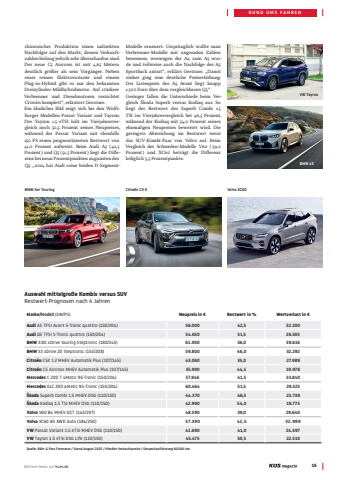 Weitere News auf kues.de 15RUND UMS FAHRENAuswahl mittelgro%u00dfe Kombis versus SUVRestwert-Prognosen nach 4 JahrenMarke/Modell (kW/PS) Neupreis in %u20ac Restwert in % Wertverlust in %u20acAudi A5 TFSI Avant 5-Tronic quattro (150/204) 56.000 42,5 32.200Audi Q5 TFSI S-Tronic quattro (150/204) 54.650 51,5 26.505BMW 330i xDrive touring Steptronic (180/245) 61.900 36,0 39.616BMW X3 xDrive 20 Steptronic (153/208) 59.800 46,0 32.292Citro%u00ebn C5X 1.2 MHEV Automatik Plus (107/145) 43.060 35,0 27.989Citro%u00ebn C5 Aircross MHEV Automatik Plus (107/145) 35.990 44,5 19.978Mercedes C 200 T 4Matic 9G-Tronic (150/204) 57.846 41,5 33.840Mercedes GLC 200 4Matic 9G-Tronic (150/204) 60.464 51,5 29.325%u0160koda Superb Combi 1.5 MHEV DSG (110/150) 44.370 46,5 23.738%u0160koda Kodiaq 1.5 TSI MHEV DSG (110/150) 42.990 54,0 19.775Volvo V60 B4 MHEV DCT (145/197) 48.590 39,0 29.640Volvo XC60 B5 AWD Auto (184/250) 57.390 42,5 32.999VW Passat Variant 1.5 eTSI MHEV DSG (110/150) 41.690 41,0 24.597VW Tayron 1.5 eTSI DSG Life (110/150) 45.475 50,5 22.510Quelle: B%u00e4hr & Fess Forecasts / Stand August 2025 / H%u00e4ndler-Verkaufspreise / Gesamtlaufleistung 80.000 km BMW x3BMW 3er Touring Citro%u00ebn C5-X Volvo XC60chinesischer Produktion einen indirekten Nachfolger auf den Markt, dessen Verkaufszahlen bislang jedoch sehr %u00fcberschaubar sind. Der neue C5 Aircross ist mit 4,65 Metern deutlich gr%u00f6%u00dfer als sein Vorg%u00e4nger. Neben einer reinen Elektrovariante und einem Plug-in-Hybrid gibt es nur den bekannten Dreizylinder-Mildhybridmotor. Auf st%u00e4rkere Verbrenner und Dieselmotoren verzichtet Citro%u00ebn komplett%u201c, erl%u00e4utert Gerstner.Ein %u00e4hnliches Bild zeigt sich bei den Wolfsburger Modellen Passat Variant und Tayron. Der Tayron 1.5 eTSI h%u00e4lt im Vierjahresvergleich noch 50,5 Prozent seines Neupreises, w%u00e4hrend der Passat Variant mit ebenfalls 150 PS einen prognostizierten Restwert von 41,0 Prozent aufweist. Beim Audi A5 (42,5 Prozent) und Q5 (51,5 Prozent) liegt die Differenz bei neun Prozentpunkten zugunsten des Q5. %u201e2024 hat Audi seine beiden D-SegmentModelle erneuert. Urspr%u00fcnglich wollte man Verbrenner-Modelle mit ungeraden Zahlen benennen, weswegen der A4 zum A5 wurde und teilweise auch die Nachfolge des A5 Sportback antrat%u201c, erkl%u00e4rt Gerstner. %u201eDamit einher ging eine deutliche Preiserh%u00f6hung: Der Listenpreis des A5 Avant liegt knapp 1.300 Euro %u00fcber dem vergleichbaren Q5.%u201cGeringer fallen die Unterschiede beim Vergleich %u0160koda Superb versus Kodiaq aus. So liegt der Restwert des Superb Combi 1.5 TSI im Vierjahresvergleich bei 46,5 Prozent, w%u00e4hrend der Kodiaq mit 54,0 Prozent seines ehemaligen Neupreises bewertet wird. Die geringste Abweichung im Restwert weist das SUV-Kombi-Paar von Volvo auf. Beim Vergleich der Schweden-Modelle V60 (39,0 Prozent) und XC60 betr%u00e4gt die Differenz lediglich 3,5 Prozentpunkte.VW Tayron