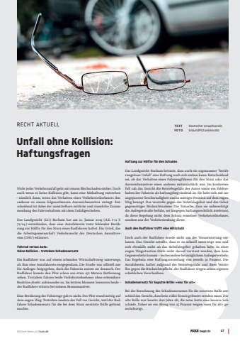 Weitere News auf kues.de 17RECHT AKTUELL RECHT AKTUELL Nicht jeder Verkehrsunfall geht mit einem Blechschaden einher. Doch auch wenn es keine Kollision gibt, kann eine Mithaftung entstehen %u2013 n%u00e4mlich dann, wenn das Verhalten eines Verkehrsteilnehmers den anderen zu einem folgenschweren Ausweichman%u00f6ver zwingt. Entscheidend ist dabei der unmittelbare zeitliche und r%u00e4umliche Zusammenhang des Fahrverhaltens mit dem Unfallgeschehen.Das Landgericht (LG) Bochum hat am 21. Januar 2025 (AZ: I-11 S 72/24) entschieden, dass eine Autofahrerin trotz fehlender Ber%u00fchrung zur H%u00e4lfte f%u00fcr den Sturz eines Radfahrers haftet. Ein Urteil, das die Arbeitsgemeinschaft Verkehrsrecht des Deutschen Anwaltvereins (DAV) erl%u00e4utert.Fahrrad versus Auto: Keine Kollision %u2013 trotzdem Schadensersatz Ein Radfahrer war auf einem schmalen Wirtschaftsweg unterwegs, als ihm eine Autofahrerin entgegenkam. Die Stra%u00dfe war offiziell nur f%u00fcr Anlieger freigegeben, doch die Fahrerin nutzte sie dennoch. Der Radfahrer konnte den Pkw schon aus etwa 150 Metern Entfernung sehen. Trotzdem fuhren beide Verkehrsteilnehmer ohne erkennbare Reaktion direkt aufeinander zu. Im letzten Moment bremsten beide %u2013 der Radfahrer st%u00fcrzte bei seinem Bremsman%u00f6ver.Eine Ber%u00fchrung der Fahrzeuge gab es nicht. Der Pkw stand mittig auf dem engen Weg. Trotzdem landete der Fall vor Gericht, weil der Radfahrer Schadensersatz f%u00fcr die bei dem Sturz zerst%u00f6rte Brille geltend machte.TEXT Deutscher Anwaltverein FOTO GroundPicture/envatoUnfall ohne Kollision: HaftungsfragenHaftung zur H%u00e4lfte f%u00fcr den SchadenDas Landgericht Bochum betonte, dass auch ein sogenannter \rungsloser Unfall\sei, ob das Verhalten eines Fahrzeugf%u00fchrers f%u00fcr den Sturz oder das Ausweichman%u00f6ver eines anderen miturs%u00e4chlich war. Im konkreten Fall sah das Gericht die Betriebsgefahr des Autos sowie ein Fehlverhalten der Fahrerin als haftungsbegr%u00fcndend an. Sie habe sich mit unangepasster Geschwindigkeit und in mittiger Position auf dem engen Weg bewegt. Das versto%u00dfe gegen das Sichtfahrgebot und das Gebot gegenseitiger R%u00fccksichtnahme. Die Tatsache, dass sie unberechtigt die Anliegerstra%u00dfe befuhr, sei hingegen haftungsrechtlich irrelevant, da diese Regelung nicht dem Schutz einzelner Verkehrsteilnehmer, sondern nur der Verkehrslenkung diene.Auch den Radfahrer trifft eine MitschuldDoch auch der Radfahrer wurde nicht aus der Verantwortung entlassen. Das Gericht urteilte, dass er zu schnell unterwegs war und sich ebenfalls nicht an das Sichtfahrgebot gehalten habe. In einer engen Wegsituation d%u00fcrfe nicht darauf vertraut werden, dass kein Gegenverkehr kommt %u2013 insbesondere bei m%u00f6glichem Anliegerverkehr. Das Ergebnis: eine Haftungsverteilung von jeweils 50 Prozent. Die Autofahrerin haftet aufgrund der Betriebsgefahr und ihres Versto%u00dfes gegen die R%u00fccksichtspflicht, der Radfahrer wegen seines eigenen erheblichen Verschuldens.Schadensersatz f%u00fcr kaputte Brille: %u00bbneu f%u00fcr alt%u00abBei der Berechnung des Schadensersatzes f%u00fcr die zerst%u00f6rte Brille entschied das Gericht, dass kein voller Ersatz geleistet werden muss. Die alte Brille war bereits drei Jahre alt, die neue hatte eine bessere Sehsch%u00e4rfe. Daher sei ein Abzug von 25 Prozent wegen %u00bbneu f%u00fcr alt%u00ab gerechtfertigt.