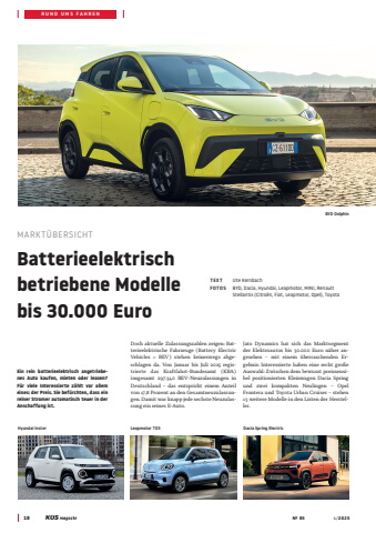 18 %u2116 85 4/2025RUND UMS FAHRENBatterieelektrisch betriebene Modelle bis 30.000 EuroMARKT%u00dcBERSICHTTEXT Ute KernbachFOTOS BYD, Dacia, Hyundai, Leapmotor, MINI, RenaultStellantis (Citro%u00ebn, Fiat, Leapmotor, Opel), ToyotaDoch aktuelle Zulassungszahlen zeigen: Batterieelektrische Fahrzeuge (Battery Electric Vehicles = BEV) stehen keineswegs abgeschlagen da. Von Januar bis Juli 2025 registrierte das Kraftfahrt-Bundesamt (KBA) insgesamt 297.340 BEV-Neuzulassungen in Deutschland %u2013 das entspricht einem Anteil von 17,8 Prozent an den Gesamtneuzulassungen. Damit war knapp jede sechste Neuzulassung ein reines E-Auto.BYD DolphinHyundai Inster Leapmotor T03 Dacia Spring ElectricEin rein batterieelektrisch angetriebenes Auto kaufen, mieten oder leasen? F%u00fcr viele Interessierte z%u00e4hlt vor allem eines: der Preis. Sie bef%u00fcrchten, dass ein reiner Stromer automatisch teuer in der Anschaffung ist.Jato Dynamics hat sich das Marktsegment der Elektroautos bis 30.000 Euro n%u00e4her angesehen %u2013 mit einem %u00fcberraschenden Ergebnis: Interessierte haben eine recht gro%u00dfe Auswahl: Zwischen dem bewusst preissensibel positionierten Kleinwagen Dacia Spring und zwei kompakten Neulingen %u2013 Opel Frontera und Toyota Urban Cruiser %u2013 stehen 13 weitere Modelle in den Listen der Hersteller.