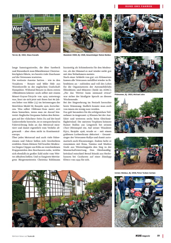 Weitere News auf kues.de 23RUND UMS FAHRENlange Samstagsstrecke, die %u00fcber Saerbeck und Riesenbeck zum Ibbenb%u00fcrener Christuskirchplatz f%u00fchrte, wo bereits viele Zuschauer auf die Veteranen warteten.Die weiteste Anreise hatten %u2013 wie in den Vorjahren %u2013 Renate und Mike Hele aus Waterlooville in der englischen Grafschaft Hampshire. W%u00e4hrend Renate in ihren ersten %u00bbIbbenb%u00fcren-Jahren%u00ab noch selbst mit einem Monet-Goyon-Tricycle von 1929 unterwegs war, l%u00e4sst sie sich jetzt mit ihren fast 86 Jahren lieber von Mike (75) im Seitenwagen der Matchless Model M, Baujahr 1926, kutschieren. Was selbst Oldtimer-Fans meist erst dann bemerken, wenn man sie darauf hinweist: Englische Gespanne haben den Beiwagen auf der %u00bbfalschen%u00ab Seite. Da auf der Insel Linksverkehr herrscht, ist er entsprechend in Fahrtrichtung links an das Motorrad montiert und damit eigentlich vom Verkehr abgewandt %u2013 aber eben nicht in Kontinentaleuropa.%u00dcber jedes Motorrad und auch viele Fahrerinnen und Fahrer lie%u00dfen sich Geschichten erz%u00e4hlen. Einen kleinen Teil brachte Moderator J%u00fcrgen C%u00fcpper aus K%u00f6ln an verschiedenen Etappenzielen den Zuschauern nahe, welche sich ebenfalls in gro%u00dfer Zahl nicht vom Wetter abhalten lie%u00dfen. Und so fungierte Mettingens B%u00fcrgermeisterin Christina R%u00e4hlmann kurzzeitig als Schirmherrin f%u00fcr den Moderator, als der Himmel es mal wieder nicht gut mit den Teilnehmern meinte.Nach einer Schleife von gut 100 Kilometern kamen alle Veteranen unfallfrei wieder in Ibbenb%u00fcren an %u2013 zufrieden und voll des Lobes f%u00fcr die Organisatoren der Automobilclubs Ibbenb%u00fcren und M%u00fcnster (beide im ADAC). %u201eF%u00fcr das Wetter kann niemand etwas%u201c war sicher der h%u00e4ufigste Spruch an diesem Wochenende. Bei der Siegerehrung im Festzelt herrschte beste Stimmung. Endlich konnte man auch von innen ein wenig nass werden.Das galt besonders f%u00fcr die erfolgreichen Teilnehmer in insgesamt 13 Klassen bei der Ausfahrt und weiteren sechs beim Gleichm%u00e4%u00dfigkeitslauf. Die meisten Troph%u00e4en heimste Rainer Baldus aus Lengerich bei seinem (Fast-)Heimspiel ein. Auf seiner Wanderer K500, Baujahr 1928, wurde er %u2013 mit einem goldenen Lorbeerkranz dekoriert %u2013 Gesamtsieger der Veteranen-Rallye und damit automatisch auch Klassensieger. Zudem holte er zusammen mit Ilona, Tamina und Markus Grafe aus Westerkappeln den Sieg in der Mannschaftswertung. Den Gleichm%u00e4%u00dfigkeitslauf entschied Bernd Stinski aus Hechthausen bei Cuxhaven auf einer Z%u00fcndapp KS600 von 1939 f%u00fcr sich.Terrot, Bj. 1922, Klaus Hassels Wanderer K500, Bj. 1928, Gesamtsieger Rainer BaldusPh%u00e4nomen, Bj. 1903, Michael JohnUnten: Nimbus, Bj. 1938, Peter Torben Carlsen