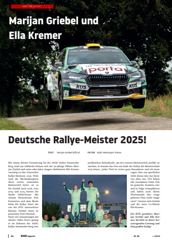 24 %u2116 85 4/2025MOTORSPORTMit einem dritten Gesamtrang bei der ADAC Rallye Stemweder Berg rund um L%u00fcbbecke kr%u00f6nen sich der 36-j%u00e4hrige Pf%u00e4lzer Marijan Griebel und seine zehn Jahre j%u00fcngere Beifahrerin Ella Kremer vorzeitig zu den Deutschen Rallye-Meistern 2025. W%u00e4hrend die Mecklenburgerin ihren ersten nationalen Meistertitel feiert, ist es f%u00fcr Griebel nach 2018, 2021, 2023 und 2024 bereits die f%u00fcnfte DRM-Krone. Mit seinem Einsatzteam Pole Promotion und dem %u0160koda Fabia RS Rally2 feiert der von der K%u00dcS unterst%u00fctzte Marijan Griebel einen lupenreinen Titel-Hattrick.Nach vier Gesamtsiegen bei ebenso vielen Starts gen%u00fcgte im Rahmen der ADAC Rallye Stemweder Berg eine problemlose Zielankunft, um das erneute Meisterst%u00fcck perfekt zu machen. So konnte das Duo am Ende der Rallye die Meisterschaft 2025 feiern. %u201eJeder Titel ist etwas ganz Besonderes und ich muss sagen, dass aus sportlicher Sicht dieses Jahr das beste von allen war. Wir haben alle zusammen keine Fehler gemacht, konnten viermal in Folge triumphieren und haben auch dieses Wochenende den vorgegebenen Plan exakt umgesetzt%u201c, freuten sich Griebel und die neue Co-Pilotin Ella Kremer.Die K%u00dcS gratuliert Marijan Griebel und Ella Kremer herzlich zu dieser herausragenden Leistung und dem gro%u00dfen Erfolg!Marijan Griebel und Ella KremerDeutsche Rallye-Meister 2025!TEXT Marijan Griebel Official FOTOS ADAC Motorsport Presse