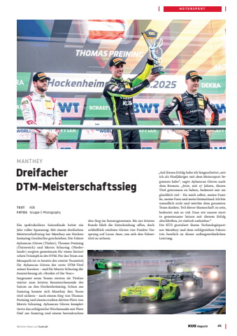 Weitere News auf kues.de 25MOTORSPORTEin spektakul%u00e4res Saisonfinale kr%u00f6nt ein Jahr voller Spannung: Mit einem dreifachen Meisterschaftssieg hat Manthey am Hockenheimring Geschichte geschrieben. Die Fahrer Ayhancan G%u00fcven (T%u00fcrkei), Thomas Preining (%u00d6sterreich) und Morris Schuring (Niederlande) sorgten gemeinsam f%u00fcr einen historischen Triumph in der DTM. F%u00fcr das Team aus Meuspath ist es bereits der zweite Teamtitel, f%u00fcr Ayhancan G%u00fcven der erste DTM-Titel seiner Karriere %u2013 und f%u00fcr Morris Schuring die Auszeichnung als %u00bbRookie of the Year%u00ab.Insgesamt neun Teams reisten als Titelanw%u00e4rter zum letzten Rennwochenende der Saison an den Hockenheimring. Schon am Samstag konnte sich Manthey den Teamtitel sichern %u2013 nach einem Sieg von Thomas Preining und einem starken dritten Platz von Morris Schuring. Ayhancan G%u00fcven komplettierte das erfolgreiche Wochenende mit Platz f%u00fcnf am Samstag und einem beeindruckenden Sieg im Sonntagsrennen. Bis zur letzten Runde blieb die Entscheidung offen, doch schlie%u00dflich reichten G%u00fcven vier Punkte Vorsprung auf Lucas Auer, um sich den Fahrertitel zu sichern.%u201eAuf diesen Erfolg habe ich hingearbeitet, seit ich als F%u00fcnfj%u00e4hriger mit dem Motorsport begonnen habe%u201c, sagte Ayhancan G%u00fcven nach dem Rennen. %u201eJetzt, mit 27 Jahren, diesen Titel gewonnen zu haben, bedeutet mir unglaublich viel %u2013 f%u00fcr mich selbst, meine Familie, meine Fans und mein Heimatland. Ich bin unendlich stolz und m%u00f6chte dem gesamten Team danken. Teil dieser Mannschaft zu sein, bedeutet mir so viel. Dass wir unsere zweite gemeinsame Saison mit diesem Erfolg abschlie%u00dfen, ist einfach unfassbar.%u201cDie K%u00dcS gratuliert ihrem Technologiepartner Manthey und dem erfolgreichen Fahrertrio herzlich zu dieser au%u00dfergew%u00f6hnlichen Leistung.TEXT K%u00dcS FOTOS Gruppe C PhotographyDreifacher DTM-Meisterschaftssieg MANTHEY