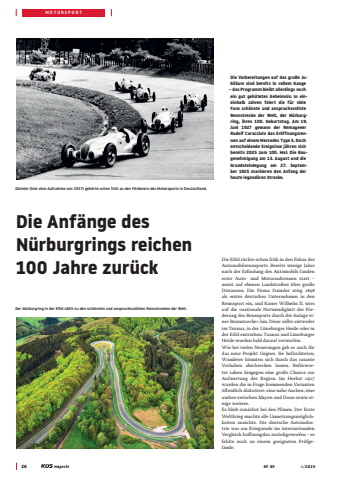 26 %u2116 85 4/2025MOTORSPORTDie Eifel r%u00fcckte schon fr%u00fch in den Fokus des Automobilrennsports. Bereits wenige Jahre nach der Erfindung des Automobils fanden erste Auto- und Motorradrennen statt %u2013 meist auf ebenen Landstra%u00dfen %u00fcber gro%u00dfe Distanzen. Die Firma Daimler stieg 1898 als erstes deutsches Unternehmen in den Rennsport ein, und Kaiser Wilhelm II. wies auf die %u00bbnationale Notwendigkeit der F%u00f6rderung des Rennsports durch die Anlage einer Rennstrecke%u00ab hin. Diese sollte entweder im Taunus, in der L%u00fcneburger Heide oder in der Eifel entstehen. Taunus und L%u00fcneburger Heide wurden bald darauf verworfen.Wie bei vielen Neuerungen gab es auch f%u00fcr das neue Projekt Gegner. Sie bef%u00fcrchteten, Wanderer k%u00f6nnten sich durch das rasante Vorhaben abschrecken lassen. Bef%u00fcrworter sahen hingegen eine gro%u00dfe Chance zur Aufwertung der Region. Im Herbst 1907 wurden die in Frage kommenden Varianten %u00f6ffentlich diskutiert: eine nahe Aachen, eine andere zwischen Mayen und Daun sowie einige weitere.Es blieb zun%u00e4chst bei den Pl%u00e4nen. Der Erste Weltkrieg machte alle Umsetzungsm%u00f6glichkeiten zunichte. Die deutsche Autoindustrie war am Kriegsende im internationalen Vergleich hoffnungslos zur%u00fcckgeworfen %u2013 es fehlte auch an einem geeigneten Pr%u00fcfgel%u00e4nde.Die Anf%u00e4nge des N%u00fcrburgrings reichen 100 Jahre zur%u00fcckDie Vorbereitungen auf das gro%u00dfe Jubil%u00e4um sind bereits in vollem Gange%u2013 das Programm bleibt allerdings noch ein gut geh%u00fctetes Geheimnis: In eineinhalb Jahren feiert die f%u00fcr viele Fans sch%u00f6nste und anspruchsvollste Rennstrecke der Welt, der N%u00fcrburgring, ihren 100. Geburtstag. Am 19. Juni 1927 gewann der Remagener Rudolf Caracciola das Er%u00f6ffnungsrennen auf einem Mercedes Type S. Doch entscheidende Ereignisse j%u00e4hren sich bereits 2025 zum 100. Mal: Die Baugenehmigung am 13. August und die Grundsteinlegung am 27. September 1925 markieren den Anfang der heute legend%u00e4ren Strecke.Daimler (hier eine Aufnahme von 1937) geh%u00f6rte schon fr%u00fch zu den F%u00f6rderern des Motorsports in Deutschland.Der N%u00fcrburgring in der Eifel z%u00e4hlt zu den sch%u00f6nsten und anspruchsvollsten Rennstrecken der Welt.