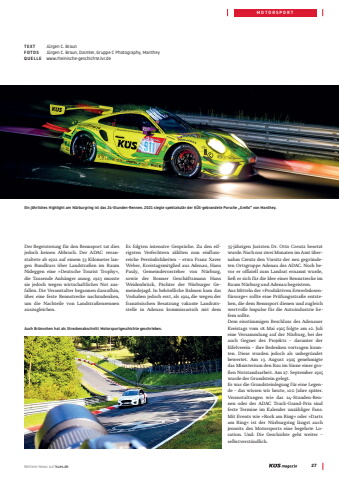 Weitere News auf kues.de 27MOTORSPORTDer Begeisterung f%u00fcr den Rennsport tat dies jedoch keinen Abbruch. Der ADAC veranstaltete ab 1922 auf einem 33 Kilometer langen Rundkurs %u00fcber Landstra%u00dfen im Raum Nideggen eine %u00bbDeutsche Tourist Trophy%u00ab, die Tausende Anh%u00e4nger anzog. 1923 musste sie jedoch wegen wirtschaftlicher Not ausfallen. Die Veranstalter begannen daraufhin, %u00fcber eine feste Rennstrecke nachzudenken, um die Nachteile von Landstra%u00dfenrennen auszugleichen.TEXT J%u00fcrgen C. Braun FOTOS J%u00fcrgen C. Braun, Daimler, Gruppe C Photography, MantheyQUELLE www.rheinische-geschichte.lvr.deEs folgten intensive Gespr%u00e4che. Zu den eifrigsten Verfechtern z%u00e4hlten nun einflussreiche Pers%u00f6nlichkeiten %u2013 etwa Franz Xaver Weber, Kreistagsmitglied aus Adenau, Hans Pauly, Gemeindevorsteher von N%u00fcrburg, sowie der Bonner Gesch%u00e4ftsmann Hans Weidenbr%u00fcck, P%u00e4chter der N%u00fcrburger Gemeindejagd. In beh%u00f6rdliche Bahnen kam das Vorhaben jedoch erst, als 1924 die wegen der franz%u00f6sischen Besatzung vakante Landratsstelle in Adenau kommissarisch mit dem 35-j%u00e4hrigen Juristen Dr. Otto Creutz besetzt wurde. Nach nur zwei Monaten im Amt %u00fcbernahm Creutz den Vorsitz der neu gegr%u00fcndeten Ortsgruppe Adenau des ADAC. Noch bevor er offiziell zum Landrat ernannt wurde, lie%u00df er sich f%u00fcr die Idee einer Rennstrecke im Raum N%u00fcrburg und Adenau begeistern.Aus Mitteln der %u00bbProduktiven Erwerbslosenf%u00fcrsorge%u00ab sollte eine Pr%u00fcfungsstra%u00dfe entstehen, die dem Rennsport dienen und zugleich wertvolle Impulse f%u00fcr die Autoindustrie liefern sollte.Dem einstimmigen Beschluss des Adenauer Kreistags vom 18. Mai 1925 folgte am 10. Juli eine Versammlung auf der N%u00fcrburg, bei der auch Gegner des Projekts %u2013 darunter der Eifelverein %u2013 ihre Bedenken vortragen konnten. Diese wurden jedoch als unbegr%u00fcndet bewertet. Am 13. August 1925 genehmigte das Ministerium den Bau im Sinne einer gro%u00dfen Notstandsarbeit. Am 27. September 1925 wurde der Grundstein gelegt.Es war die Grundsteinlegung f%u00fcr eine Legende %u2013 das wissen wir heute, 100 Jahre sp%u00e4ter. Veranstaltungen wie das 24-Stunden-Rennen oder der ADAC Truck-Grand-Prix sind feste Termine im Kalender unz%u00e4hliger Fans. Mit Events wie %u00bbRock am Ring%u00ab oder %u00bbDarts am Ring%u00ab ist der N%u00fcrburgring l%u00e4ngst auch jenseits des Motorsports eine begehrte Location. Und: Die Geschichte geht weiter %u2013 selbstverst%u00e4ndlich.Auch Br%u00fcnnchen hat als Streckenabschnitt Motorsportgeschichte geschrieben.Ein j%u00e4hrliches Highlight am N%u00fcrburgring ist das 24-Stunden-Rennen. 2021 siegte spektakul%u00e4r der K%u00dcS-gebrandete Porsche %u201eGrello%u201c von Manthey.