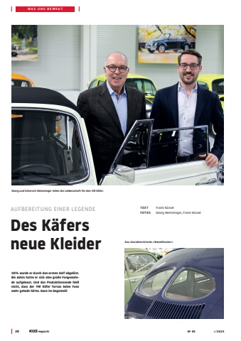 28 %u2116 85 4/2025WAS UNS BEWEGTTEXT Frank N%u00fcsselFOTOS Georg Memminger, Frank N%u00fcsselDes K%u00e4fers neue KleiderAUFBEREITUNG EINER LEGENDEGeorg und Schorsch Memminger teilen die Leidenschaft f%u00fcr den VW K%u00e4fer.Das charakteristische %u00bbBrezelfenster%u00ab1974 wurde er durch den ersten Golf abgel%u00f6st. Bis dahin hatte er sich eine gro%u00dfe Fangemeinde aufgebaut. Und das Produktionsende hie%u00df nicht, dass der VW K%u00e4fer fortan keine Fans mehr gehabt h%u00e4tte. Ganz im Gegenteil!