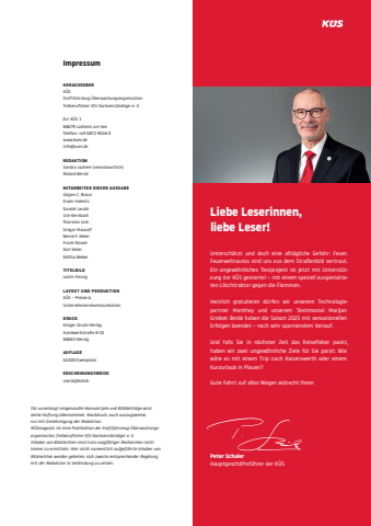 Liebe Leserinnen, liebe Leser!Untersch%u00e4tzt und doch eine allt%u00e4gliche Gefahr: Feuer. Feuerwehrautos sind uns aus dem Stra%u00dfenbild vertraut. Ein ungew%u00f6hnliches Testprojekt ist jetzt mit Unterst%u00fctzung der K%u00dcS gestartet %u2013 mit einem speziell ausgestatteten L%u00f6schtraktor gegen die Flammen.Herzlich gratulieren d%u00fcrfen wir unserem Technologiepartner Manthey und unserem Testimonial Marijan Griebel: Beide haben die Saison 2025 mit sensationellen Erfolgen beendet %u2013 nach sehr spannendem Verlauf.Und falls Sie in n%u00e4chster Zeit das Reisefieber packt, haben wir zwei ungew%u00f6hnliche Ziele f%u00fcr Sie parat: Wie w%u00e4re es mit einem Trip nach Kaiserswerth oder einem Kurzurlaub in Plauen?Gute Fahrt auf allen Wegen w%u00fcnscht IhnenPeter SchulerHauptgesch%u00e4ftsf%u00fchrer der K%u00dcSImpressumHERAUSGEBERK%u00dcS Kraftfahrzeug-%u00dcberwachungsorganisation freiberuflicher Kfz-Sachverst%u00e4ndiger e. V.Zur K%u00dcS 166679 Losheim am SeeTelefon: +49 6872 9016-0www.kues.deinfo@kues.deREDAKTIONSandra Jochem (verantwortlich)Roland BerndMITARBEITER DIESER AUSGABEJ%u00fcrgen C. BraunErwin HalentzGundel JacobiUte KernbachThorsten LinkGregor MausolfBernd F. MeierFrank N%u00fcsselKarl SeilerEditha WeberTITELBILDJustin HerzigLAYOUT UND PRODUKTIONK%u00dcS %u2013 Presse & UnternehmenskommunikationDRUCKKr%u00fcger Druck+VerlagHandwerkstra%u00dfe 8-1066663 MerzigAUFLAGE10.000 ExemplareERSCHEINUNGSWEISEviertelj%u00e4hrlichF%u00fcr unverlangt eingesandte Manuskripte und Bildbeitr%u00e4ge wird keine Haftung %u00fcbernommen. Nachdruck, auch auszugsweise,nur mit Genehmigung der Redaktion.K%u00dcSmagazin ist eine Publikation der Kraftfahrzeug-%u00dcberwachungsorganisation freiberuflicher Kfz-Sachverst%u00e4ndiger e. V. Inhaber von Bildrechten sind trotz sorgf%u00e4ltiger Recherchen nicht immer zu ermitteln. Hier nicht namentlich aufgef%u00fchrte Inhaber von Bildrechten werden gebeten, sich zwecks entsprechender Regelung mit der Redaktion in Verbindung zu setzen.