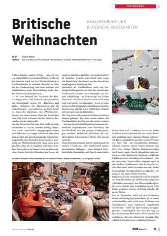 Weitere News auf kues.de 33UNTERWEGSAndere L%u00e4nder, andere Sitten %u2013 was oft wie ein abgenutzter Gemeinplatz klingt, trifft auf die Br%u00e4uche rund um das Weihnachtsfest in Gro%u00dfbritannien in vielerlei Hinsicht zu. Wer bei der Vorbereitung und dem Erleben von Weihnachten nach Abwechslung sucht, findet hier reichlich Inspiration.Da ist zum Beispiel die Tradition des Mistelzweigs, dem Cliff Richard 1988 p%u00fcnktlich zur Adventszeit seinen Hit %u00bbMistletoe and Wine%u00ab widmete. Der Mistelzweig gilt als Gl%u00fccksbringer %u2013 no mistletoe, no luck, hei%u00dft es. Auch der christmas tree (Weihnachtsbaum) hat einen festen Platz im britischen Fest: Oft wird er bereits ab der zweiten Dezemberwoche aufgestellt.Um die Wartezeit bis zum Fest nicht zu lang erscheinen zu lassen, werden flei%u00dfig christmas cards verschickt, entgegengenommen und dekorativ an langen Schn%u00fcren %u00fcber dem Kamin oder auf dem Kaminsims pr%u00e4sentiert. Angesichts der beeindruckend gro%u00dfen Auswahl an Weihnachtskarten mag man gern glauben, dass sie in England erfunden wurden. Zwar gibt es sie l%u00e4ngst auch in elektronischer Form, doch der Klassiker aus Papier ist Britische Weihnachtenauch im digitalen Zeitalter weiterhin beliebt. In mancher Familie entwickelt sich sogar ein heimlicher Wettstreit um die Anzahl der empfangenen Festtagsgr%u00fc%u00dfe.Nat%u00fcrlich ist Weihnachten auch im Vereinigten K%u00f6nigreich ein Fest der Geschenke. Traditionell werden rote Str%u00fcmpfe am Kamin aufgeh%u00e4ngt %u2013 in Erwartung von father christmas, der durch den Schornstein kommt und erst wieder verschwindet, wenn er seine Gaben in den Str%u00fcmpfen hinterlassen hat. Die Bescherung erfolgt nach britischem Brauch erst morgens am 25. Dezember. Der Tag wird mit einem festlichen christmas dinner gefeiert. Vor dem Essen ziehen die Tischnachbarn kr%u00e4ftig am christmas cracker %u2013 aus den bunten Knallbonbons kommen farbenfrohe Papierkronen zum Vorschein, die anschlie%u00dfend von der ganzen Runde getragen werden. Au%u00dferdem enthalten die crackers kleine Scherzartikel, R%u00e4tsel oder lustige Spr%u00fcche. Zum christmas dinner geh%u00f6rt traditionell ein turkey (Truthahn) mit traditionell genau bestimmten Beilagen %u2013 zum Beispiel R%u00f6stkartoffeln, Rosenkohl, mit Speck umwickelte W%u00fcrstchen und Cranberry-Sauce. In vielen Familien wird au%u00dferdem bis heute ein christmas pudding nach eigenem Rezept zubereitet. Diese Spezialit%u00e4t entsteht schon Wochen vor dem Fest aus Trockenobst, Orangenschalen, N%u00fcssen, einem Schuss Brandy und Fett. Das fr%u00fcher %u00fcbliche Rindernierenfett wird heute meist durch pflanzliche Alternativen ersetzt. Durch die Reifezeit erh%u00e4lt der Pudding seinen besonderen Geschmack %u2013 wie der deutsche Christstollen. Serviert wird er mit hei%u00dfer Vanillesauce oder Brandybutter. Wer ihn nicht selbst machen m%u00f6chte, findet hochwertige Fertigprodukte im Handel %u2013 sie m%u00fcssen nur noch erhitzt werden.Nach dem Essen versammelt sich die Familie vor dem Fernseher zur Weihnachtsansprache (christmas message) des Staatsoberhauptes. Die erste wurde 1932 von K%u00f6nig Georg V. im Radio gehalten. Heute ist K%u00f6nig Charles III. an der Reihe.Der 26. Dezember wird auf den Britischen Inseln als boxing day bezeichnet. Er ist meist verkaufsoffen und wird zum Einl%u00f6sen von Gutscheinen, zum Umtausch ungeliebter Geschenke %u2013 oder f%u00fcr Sportveranstaltungen genutzt. Urspr%u00fcnglich war dies der Tag, an dem Bedienstete beschenkt oder Spenden f%u00fcr wohlt%u00e4tige Zwecke %u00fcberreicht wurden. Das erkl%u00e4rt auch den oben erw%u00e4hnten Namen.KNALLBONBONS UND KLASSISCHE GRUSSKARTENTEXT Editha WeberFOTOS picture alliance (The Picture Pantry/Amani Lindsell, Westend61/Mareen Fischinger)Vor dem Christmas Dinner kommen die christmas crackers %u2013 bunte Knallbonbons f%u00fcr die ganze Familie.