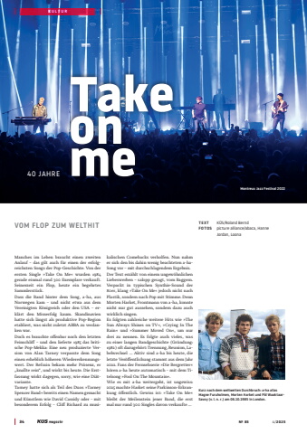 34 %u2116 85 4/2025KULTURManches im Leben braucht einen zweiten Anlauf %u2013 das gilt auch f%u00fcr einen der erfolgreichsten Songs der Pop-Geschichte. Von der ersten Single %u00bbTake On Me%u00ab wurden 1984 gerade einmal rund 300 Exemplare verkauft. Seinerzeit ein Flop, heute ein begehrtes Sammlerst%u00fcck.Dass die Band hinter dem Song, a-ha, aus Norwegen kam %u2013 und nicht etwa aus dem Vereinigten K%u00f6nigreich oder den USA %u2013 erkl%u00e4rt den Misserfolg kaum. Skandinavien hatte sich l%u00e4ngst als produktive Pop-Region etabliert, was nicht zuletzt ABBA zu verdanken war.Doch es brauchte offenbar noch den letzten Feinschliff %u2013 und den lieferte 1985 das britische Pop-Mekka: Eine neu produzierte Version von Alan Tarney verpasste dem Song einen erheblich h%u00f6heren Wiedererkennungswert. Der Refrain bekam mehr Pr%u00e4senz, er %u201eknallte rein%u201c, und wirkt bis heute. Die Erstfassung wirkt dagegen, sorry, wie eine Di%u00e4tvariante.Tarney hatte sich als Teil des Duos %u00bbTarney Spencer Band%u00ab bereits einen Namen gemacht und K%u00fcnstlern wie David Cassidy oder %u2013 mit besonderem Erfolg %u2013 Cliff Richard zu musiTEXT K%u00dcS/Roland BerndFOTOS picture alliance/abaca, Hanne Jordan, Loona kalischen Comebacks verholfen. Nun nahm er sich den bis dahin wenig beachteten a-haSong vor %u2013 mit durchschlagendem Ergebnis.Der Text erz%u00e4hlt von einem ungew%u00f6hnlichen Liebeswerben %u2013 salopp gesagt, vom Baggern. Verpackt in typischen Synthie-Sound der 80er, klang %u00bbTake On Me%u00ab jedoch nicht nach Plastik, sondern nach Pop mit Stimme. Denn Morten Harket, Frontmann von a-ha, konnte nicht nur gut aussehen, sondern dazu auch wirklich singen.Es folgten zahlreiche weitere Hits wie %u00bbThe Sun Always Shines on TV%u00ab, %u00bbCrying In The Rain%u00ab und %u00bbSummer Moved On%u00ab, um nur drei zu nennen. Es folgte auch vieles, was zu einer langen Bandgeschichte (Gr%u00fcndung: 1982) oft dazugeh%u00f6rt: Trennung, Reunion, Labelwechsel %u2026 Aktiv sind a-ha bis heute, die letzte Ver%u00f6ffentlichung stammt aus dem Jahr 2022. Fans der Fernsehserie %u00bbDie Bergretter%u00ab h%u00f6ren a-ha heute automatisch %u2013 mit dem Titelsong %u00bbFool On The Mountain%u00ab.Wie es mit a-ha weitergeht, ist ungewiss: 2025 machte Harket seine Parkinson-Erkrankung %u00f6ffentlich. Gewiss ist: %u00bbTake On Me%u00ab bleibt der Meilenstein jener Band, die erst mal nur rund 300 Singles davon verkaufte %u2026VOM FLOP ZUM WELTHITKurz nach dem weltweiten Durchbruch: a-ha alias Magne Furuholmen, Morten Harket und P%u00e5l WaaktaarSavoy (v. l. n. r.) am 06.10.1985 in London.Take on 40 JAHRE meMontreux Jazz Festival 2022
