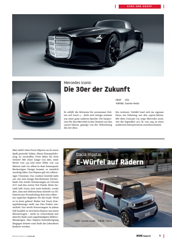 Weitere News auf kues.de 5KURZ UND KNAPPMan sieht%u2019s dem Dacia Hipster an: Es muss Spa%u00df gemacht haben, dieses Konzeptfahrzeug zu erschaffen. Freie Bahn f%u00fcr freie Geister! Mit einer L%u00e4nge von drei, einer Breite von 1,55 und einer H%u00f6he von 1,52 Metern und vor allem in dem konsequent blockartigen Design kommt er ziemlich wuchtig r%u00fcber. Der Hipster gilt als vollwertiger Viersitzer. Das vordere Gest%u00fchl sieht aus wie eine knapp durchtrennte Zweierbank. Das weckt Erinnerungen an Citro%u00ebn 2CV und den ersten Fiat Panda. Beim Antrieb h%u00e4lt Dacia sich noch bedeckt, verr%u00e4t aber, dass mit elektrischem Antrieb 120 Kilometer pro Stromladung drin sein sollen %u2013 ein typischer Begleiter f%u00fcr die Stadt. Wird er in Serie gehen? Bisher hat Dacia Konzeptfahrzeuge nicht nur f%u00fcrs Podest entwickelt. Das weckt Erwartungen. In jedem Fall handelt es sich beim Hipster um einen Kleinstwagen %u2013 nicht zu verwechseln mit dem f%u00fcr Ende 2026 angek%u00fcndigten ElektroKleinwagen. Eine Hipster-Serienfertigung hingegen k%u00f6nnte zum Ende des Jahrzehnts konkret werden. Dacia HipsterE-W%u00fcrfel auf R%u00e4dernMercedes IconicDie 30er der ZukunftTEXT K%u00dcSFOTOS Daimler MediaEr erf%u00fcllt die Kriterien f%u00fcr autonomes Fahren auf Level 4 %u2013 doch sein Design stammt aus einer ganz anderen Epoche. Die Inspiration f%u00fcr den Mercedes Iconic kommt aus den 1930er-Jahren, gepr%u00e4gt von der Stilrichtung des Art d%u00e9co.Ein weiteres Vorbild fand sich im eigenen Haus: ein Fahrzeug aus den 1950er-Jahren. Mit dem Concept Car zeigt Mercedes auch, wie der legend%u00e4re 300 SL von 1954 in einer modernen Interpretation aussehen k%u00f6nnte.TEXT Gundel Jacobi FOTO Dacia