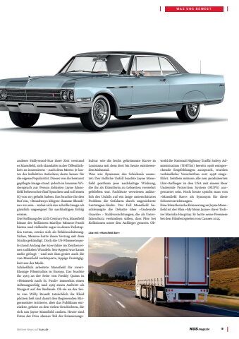 Weitere News auf kues.de 9WAS UNS BEWEGTanderer Hollywood-Star ihrer Zeit verstand es Mansfield, sich skandal%u00f6s in der %u00d6ffentlichkeit zu inszenieren %u2013 nach dem Motto: Je lauter der kollektive Aufschrei, desto besser f%u00fcr die eigene Popularit%u00e4t. Dieses von ihr bewusst gepflegte Image stand jedoch in krassem Widerspruch zur Person dahinter: Jayne Mansfield beherrschte f%u00fcnf Sprachen und soll einen IQ von 163 gehabt haben. Das brachte ihr den Ruf ein, %u00bbBroadways kl%u00fcgste dumme Blondine%u00ab zu sein %u2013 wobei sich das schrille Image als g%u00e4nzlich ungeeignet f%u00fcr nachhaltigen Erfolg erwies.Die Hoffnung der 20th Century Fox, Mansfield k%u00f6nne der brillanten Marilyn Monroe Paroli bieten und vielleicht sogar in deren Fu%u00dfstapfen treten, erwies sich als Fehleinsch%u00e4tzung. Sicher, Monroe hatte ihren Vertrag mit dem Studio gek%u00fcndigt. Doch die US-Filmmetropole stand Anfang der 60er-Jahre im Zeichen eines radikalen Wandels: Sex-Appeal war kaum mehr gefragt %u2013 und mit ihm geriet auch die von Mansfield verk%u00f6rperte, %u00fcppige Freiz%u00fcgigkeit aus der Mode.Schlie%u00dflich arbeitete Mansfield f%u00fcr zweitklassige Filmstudios in Europa. Das brachte ihr 1963 an der Seite von Freddy Quinn in %u00bbHeimweh nach St. Pauli%u00ab immerhin einen Achtungserfolg und 1965 einen Auftritt als Stargast auf der Berlinale. Ob sie an der Seite von Willy Brandt tats%u00e4chlich ihr Kleid platzen lie%u00df und damit den Regierenden B%u00fcrgermeister irritierte, aber das Publikum entz%u00fcckte, geh%u00f6rt zu den vielen Geschichten, die sich um Jayne Mansfield ranken. Heute sind Fotos der Diva ebenso Teil der Erinnerungskultur wie die leicht gekr%u00fcmmte Kurve in Louisiana mit dem dort bis heute existierenden Mahnmal.Was wie Zynismus des Schicksals anmutet: Der t%u00f6dliche Unfall brachte Jayne Mansfield posthum jene nachhaltige Wirkung, die ihr als K%u00fcnstlerin zu Lebzeiten verwehrt geblieben war. Fachleute verwiesen anl%u00e4sslich des Unfalls auf ein lange untersch%u00e4tztes Problem: die Gefahren durch ungesicherte Lastwagen-Hecks. Der Fall Mansfield beschleunigte die Debatte %u00fcber %u00bbUnderride Guards%u00ab %u2013 Stahlvorrichtungen, die als Unterfahrschutz verhindern sollen, dass Pkw bei Kollisionen unter den Auflieger geraten. Obwohl die National Highway Traffic Safety Administration (NHTSA) bereits 1968 entsprechende Empfehlungen aussprach, wurden verbindliche Vorschriften erst 1998 eingef%u00fchrt. Seitdem m%u00fcssen alle neu produzierten Lkw-Auflieger in den USA mit einem Rear Underride Protection System (RUPS) ausgestattet sein. Noch heute spricht man von %u00bbMansfield Bars%u00ab als Synonym f%u00fcr diese Schutzvorrichtungen. Eine k%u00fcnstlerische Erinnerung an Jayne Mansfield ist der Film %u00bbMy Mom Jayne%u00ab ihrer Tochter Mariska Hargitay. Er hatte seine Premiere bei den Filmfestspielen von Cannes 2025.Lkw mit %u00bbMansfield Bar%u00ab