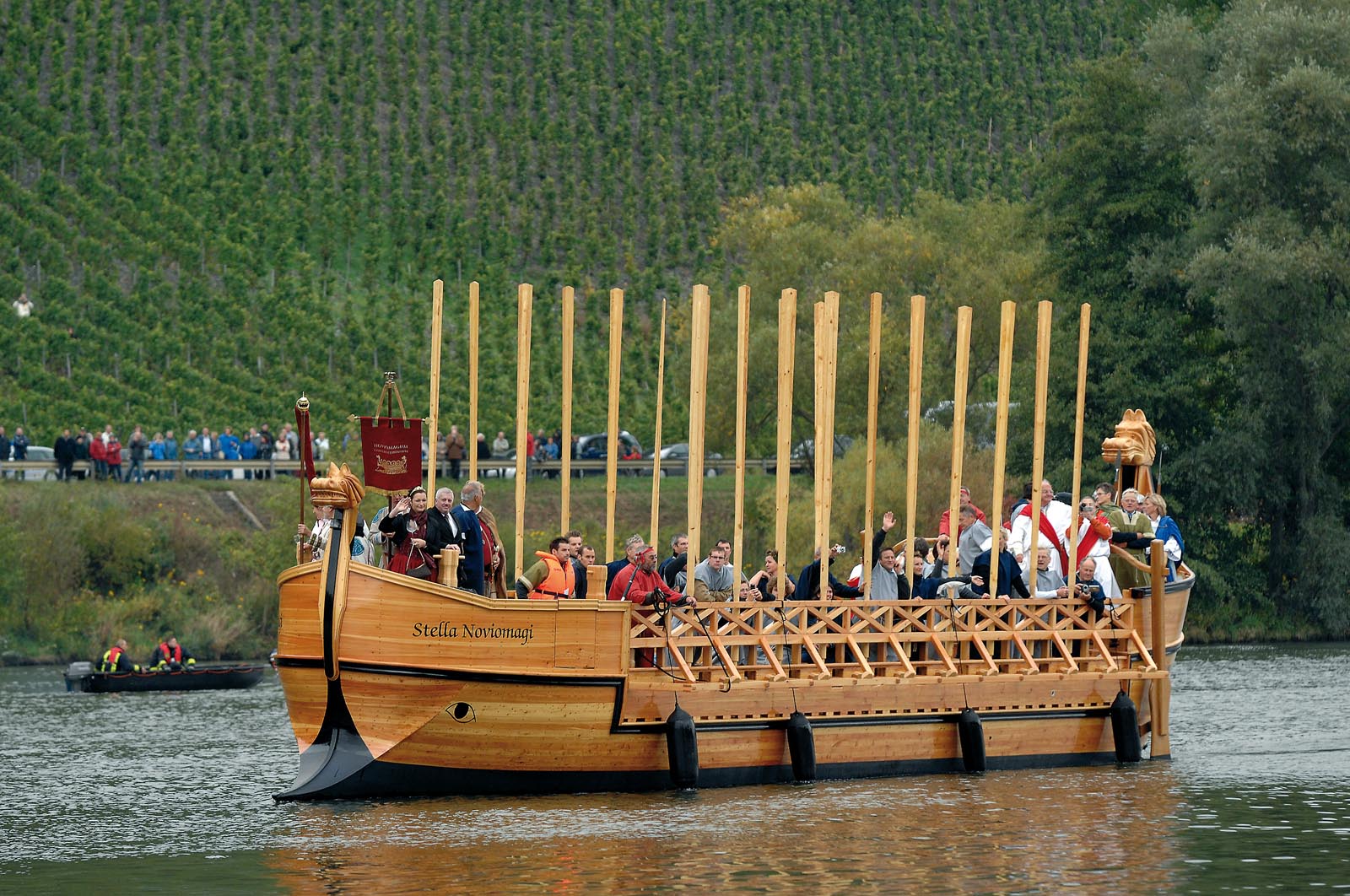 «Stella Noviomagi», was aus dem Lateinischen übersetzt so viel wie «Stern von Neumagen», bedeutet, ist eine alte römische Handelsgaleere, die Lehrlinge der Handwerkskammer Trier in monatelanger Arbeit zusammen zimmerten. Original nachgebaut nach etwa 1.700 Jahre Vorlagen der alten Römer, bestückt mit gängigen Sicherheitsvorschriften, aber eben auch mit zwei modernen 50 PS starken Dieselmotoren, wenn denn ein «postromanischer» Antrieb aus dem Maschinenraum einmal nötig sein sollte.