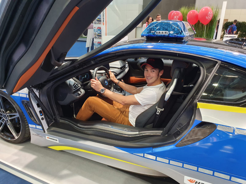 Die KÜS war auch im Jahr 2019 auf der Internationalen Automobil Ausstellung IAA in Frankfurt. Blickfang war das Kampagnenfahrzeug der Initiative TUNE IT! SAFE! Hier ist die KÜS ebenfalls engagiert, wenn es um sichere Änderungen am Fahrzeug geht. In diesem Jahr stand ein BMW i8 im Polizeilook auf dem KÜS-Stand. Es gab auch einen Besucher der absolut berechtigt war, in dem Fahrzeug Platz zu nehmen. Rallye-Ass Marijan Griebel kam zum Stand. Der Deutsche Rallyemeister 2018 und erfolgreicher Pilot bei vielen internationalen Veranstaltungen ist im Hauptberuf Polizeibeamter. Gewohnt schlüpfte er in den Schalensitz und träumte vom i8 als Dienstwagen. Marijan Griebel traf auch einen alten Bekannten wieder. KÜS-Prüfingenieur Stefan Ehl ist seit längerem Technischer Kommissar bei Motorsportveranstaltungen, vor allem bei der Rallye Deutschland. Beim nationalen Weltmeisterschaftslauf war er für die Aufsicht in Sachen technisches Reglement beim Werksteam von Citroën zuständig und schaute Mehrfachweltmeister Sébastien Ogier über die Schulter. Auch Marijan Griebel hat gute Erinnerungen an die Rallye. In einem starken Starterfeld in der Kategorie WRC 2 belegte er den zweiten Rang. Die KÜS hatte Marijan Griebel unterstützt.