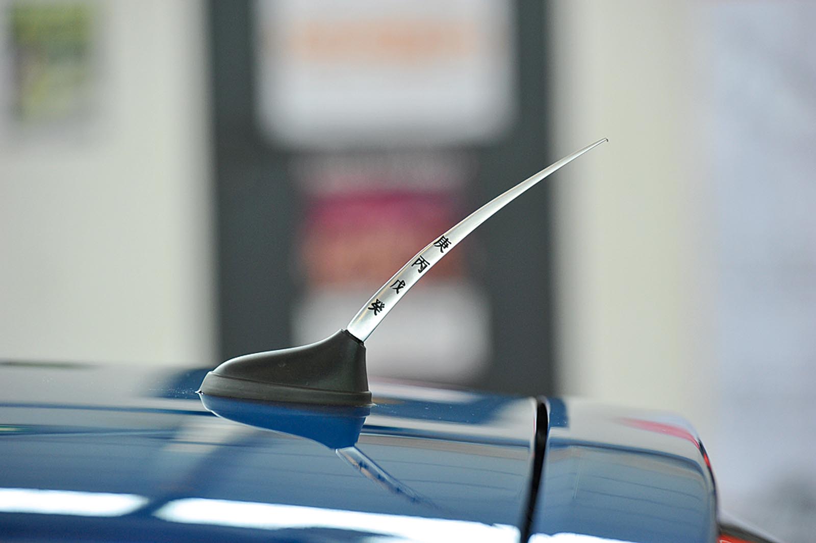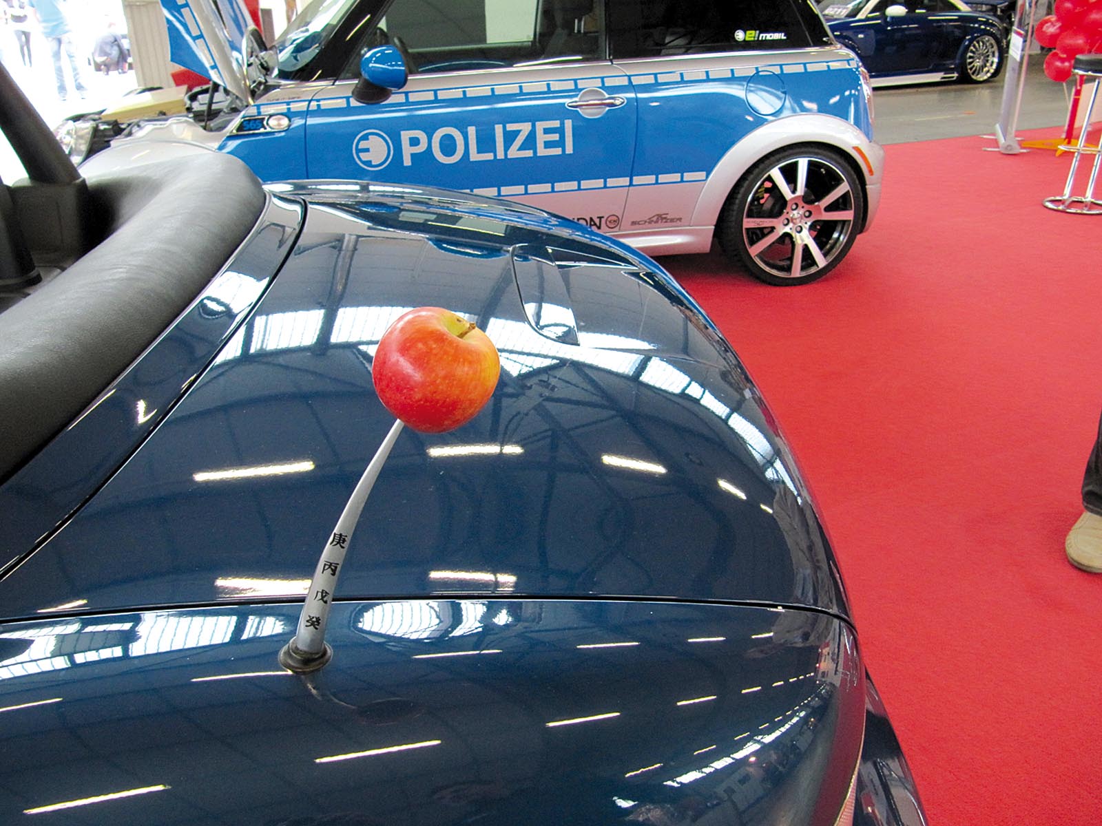 Nicht alles, was gefällt, ist auch erlaubt und sicher. Die Antenne im Look eines Samurai-Schwertes mag manchem gefallen. Was sie aber im Straßenverkehr anrichten kann, illustriert eine einfache Demonstration: Ein Apfel kann durch diese Antenne problemlos aufgespießt werden. Im Ernstfall auf der Straße wird es nicht bei einem Apfel bleiben.